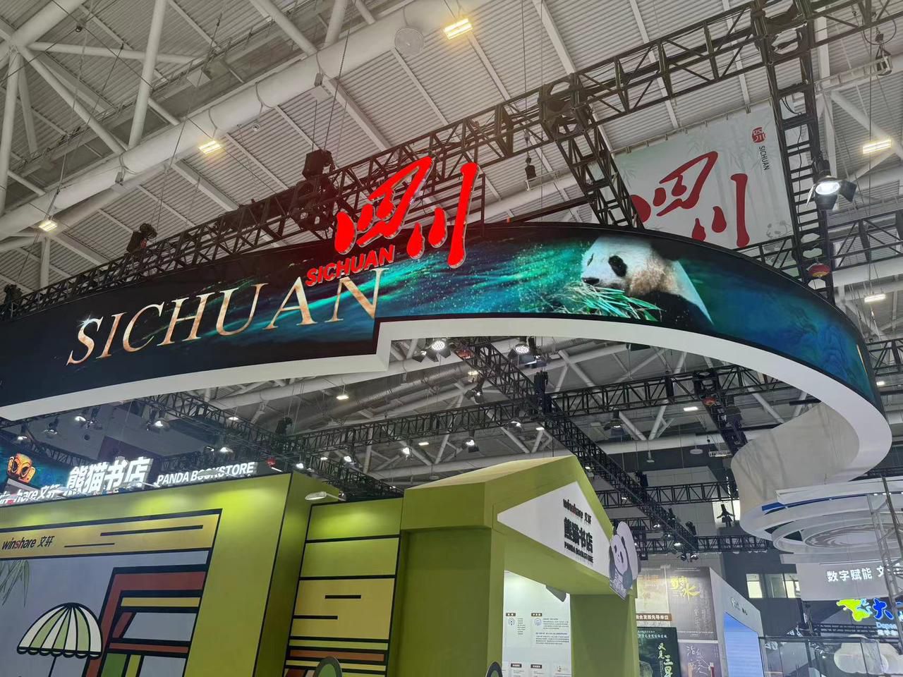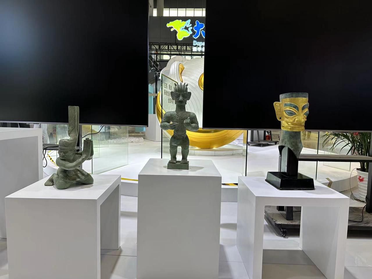 其中,四川展区位于15号展馆,总面积810平方米,展区顶部环形LED屏滚动播放着三星堆、大熊猫的形象,四川元素妥妥的“吸睛”。展区内部分为“数字赋能新气象、数字转型新活力、数字消费新场景、数字文化新业态”4个板块,展示四川文化产业高质量发展取得的新成效。值得一提的是,三星堆新出土文物——戴金面罩青铜人头像、青铜扭头跪坐人像、青铜着裙立人像文物复制品也来到了文博会的现场,让现场观众不用去四川,也能一睹珍贵文物的风采!