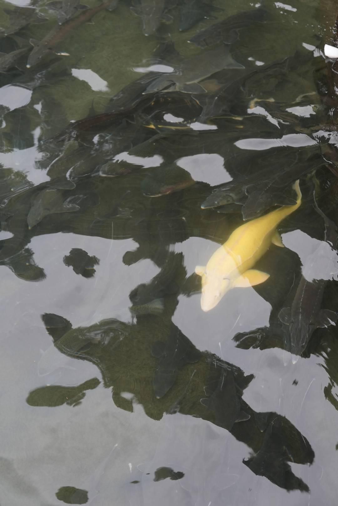 王艳锋家鱼池里的鲟鱼。(肖洋 摄)