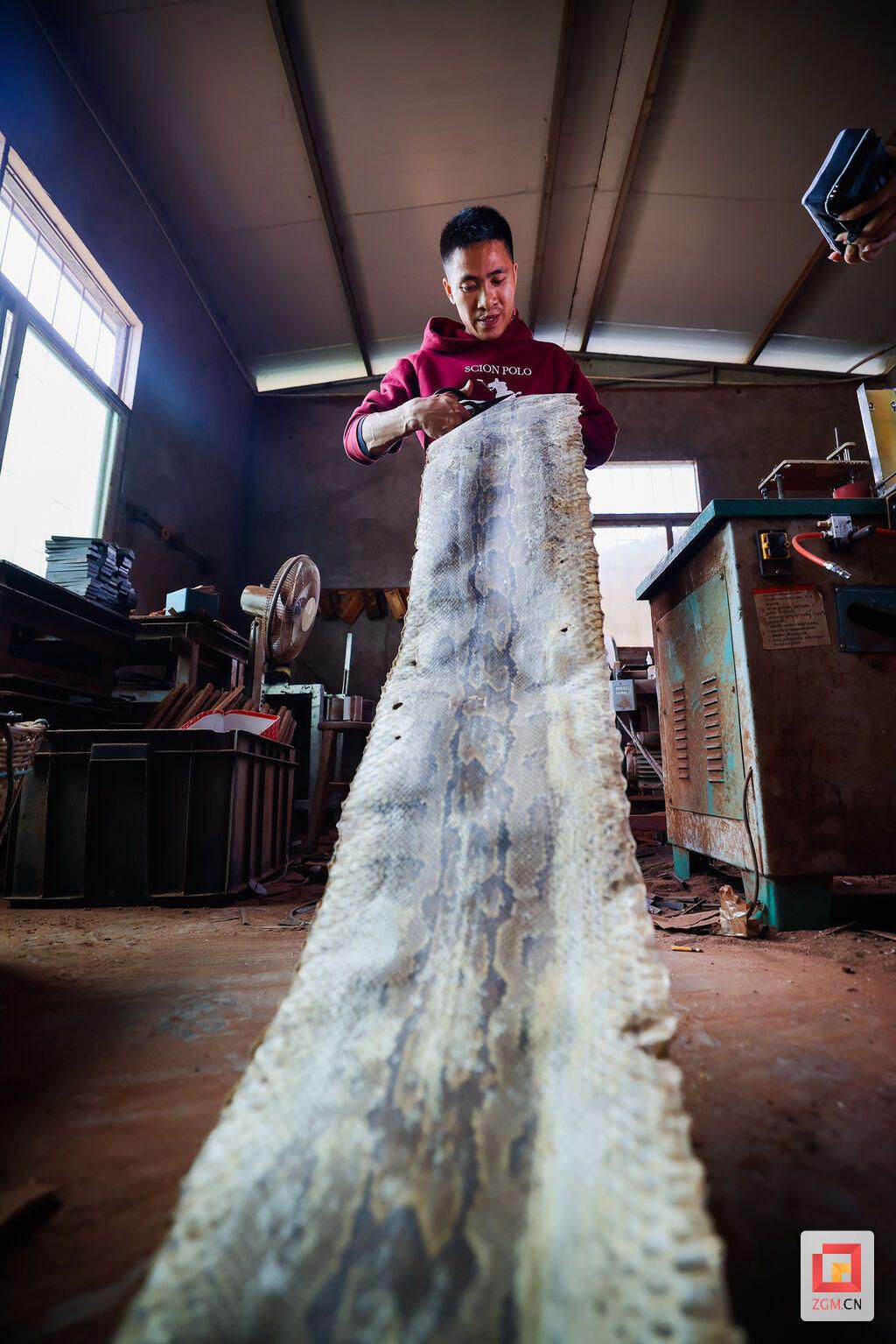 剪裁蟒蛇皮 记者 宋姿熠 摄