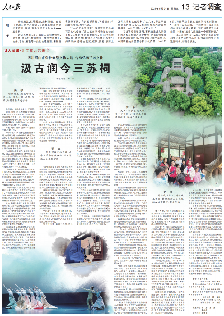 5月24日,人民日报整版聚焦眉山以三苏祠为依托,着力推进文物和文化遗产保护传承利用,推动三苏文化创造性转化、创新性发展。