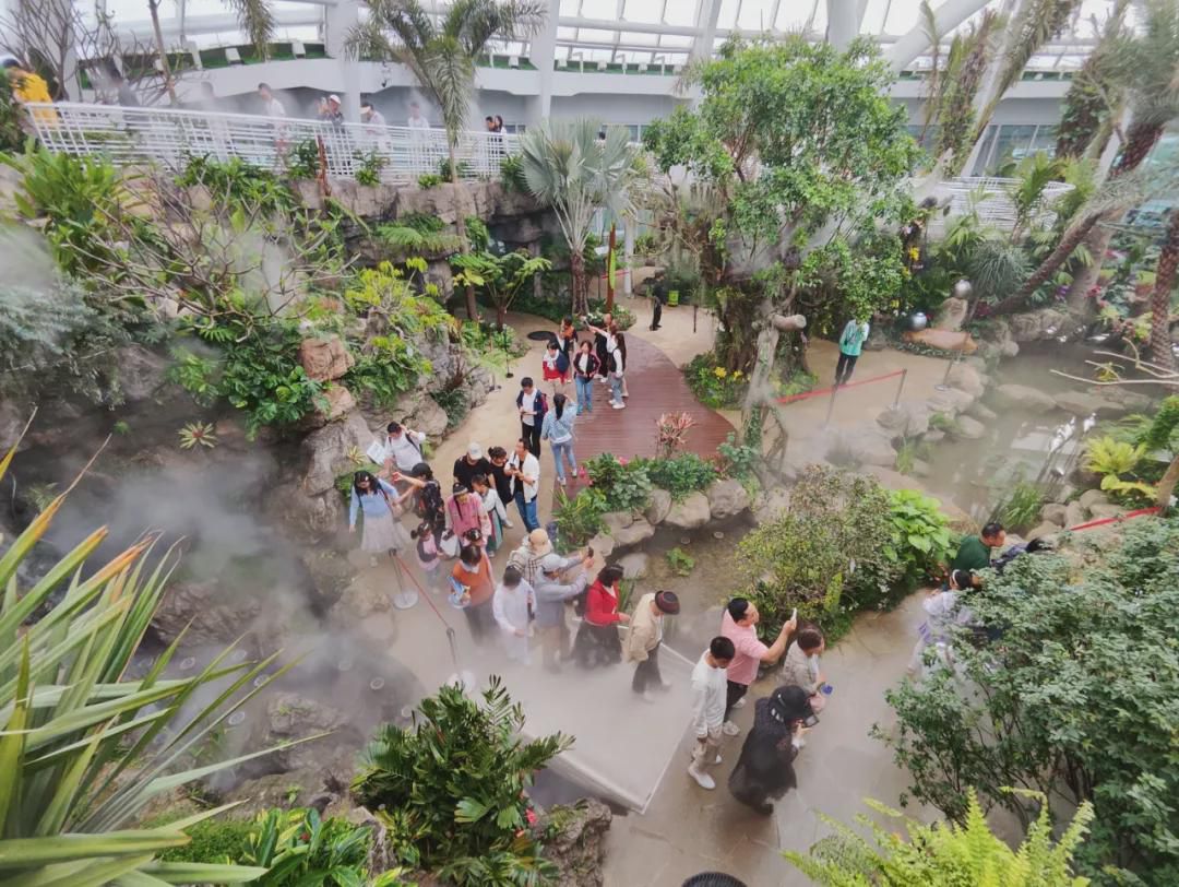 在植物馆的温室馆内,植物生长在闷热、潮湿的空气之中,这里枝叶纵横交错,灌木阴暗潮湿,多干成林、植物绞杀等热带雨林常见现象也被原汁原味地“复刻”进来。“馆内种植了200多种来自世界各地的热带植物,辅以山体、急流、瀑布等景观,立体模拟出热带雨林生境。”成都世园会植物馆工程师潘宏磊说。