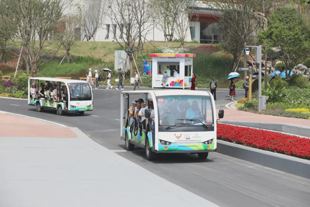 在园区内,观光车是游客饱览园区美景的重要工具。为提升游客的游园体验,园区在原有6个站点的基础上,增加了成都园站、天府人居站和抚锦驿站,加密游客坐车站点,同时还增加了观光车充电装置,保证观光车能高效运转。