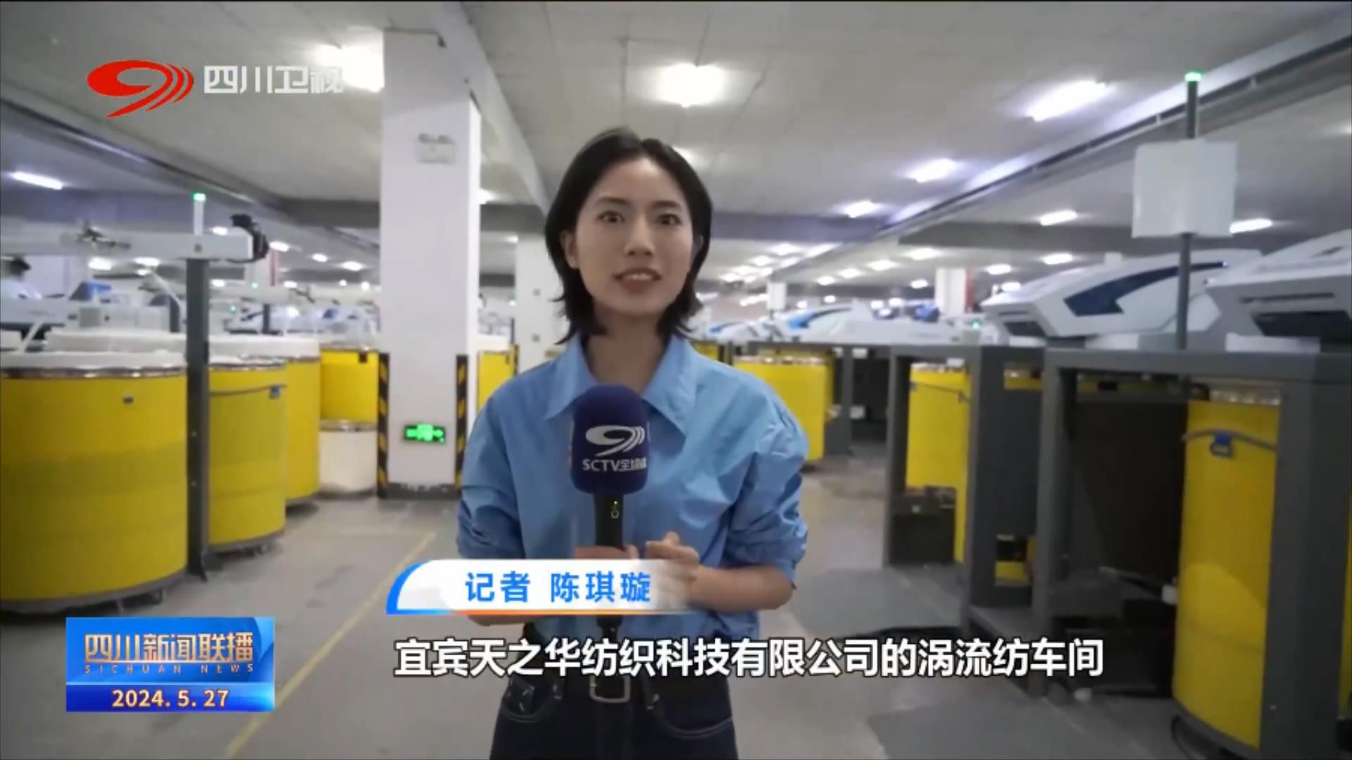 记者 陈琪璇:我现在是在宜宾天之华纺织科技有限公司的涡流纺车间,在我身后原料棉条正以每分钟550米的速度上下飞转,“变身”为一锭锭成品纱线,每天这个车间能够产出约36吨纱线。