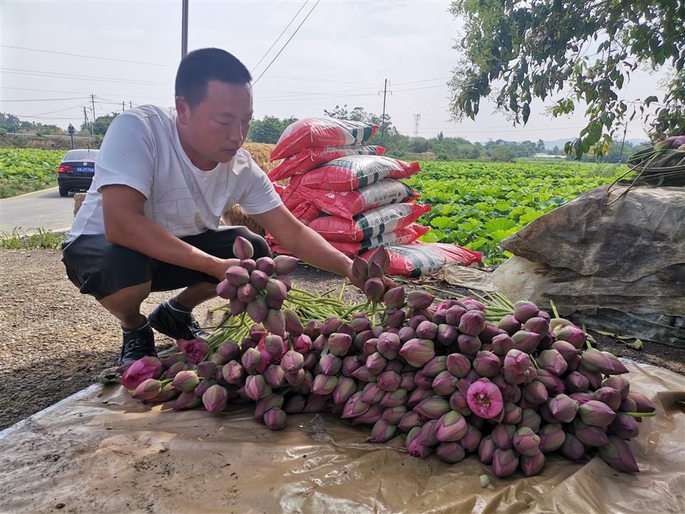 “早上刚刚送了600枝走,现在要赶紧把这些捆好,马上送到电商平台和三圣花乡去。”宝胜村村委会旁不远,村道旁的一处浓荫下,荷塘主人张强正和家人忙着点数、捆扎着一枝枝新采下的荷花花骨朵。十来位工人把刚从塘里采下的荷花层层叠叠堆在一旁,稍作短暂休息,又开始下塘开始新一轮采摘了。