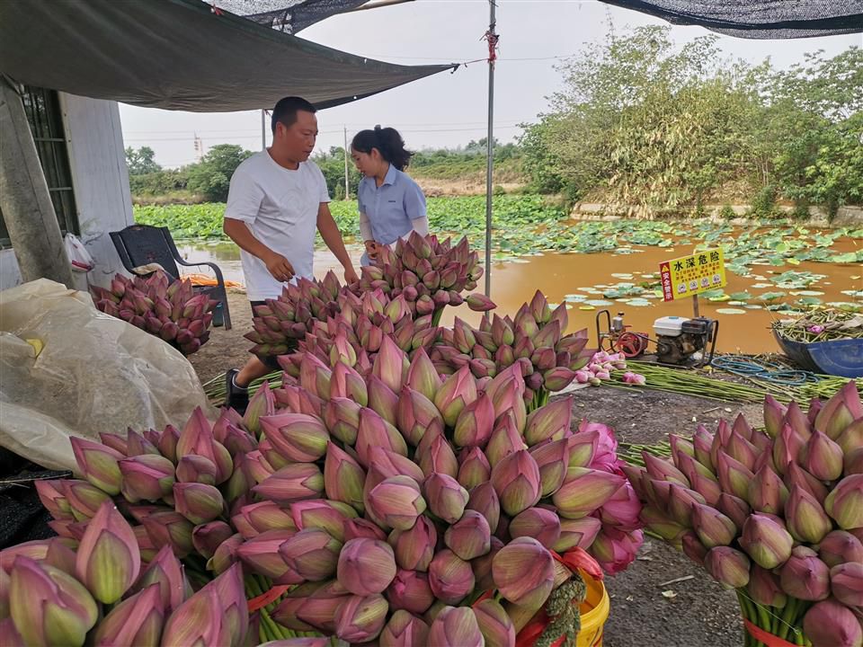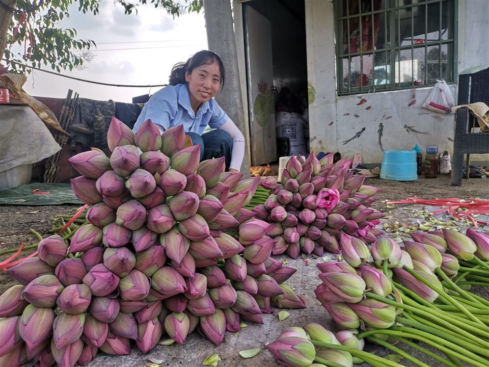 “从5月14号开始采荷花,每天有七八千枝甚至上万枝,批发价每枝一元多点,后期随着气温升高,还会更多。”点好数,小心翼翼地按100根一把捆好,用铡刀切去多余的茎,再放进一旁的水桶里,张强和父亲、妻子密切配合,有条不紊。张强介绍,这些花一是销往合作的电商平台,可卖到北京、上海、陕西等地,二是送到三圣花乡,满足当地市场需求。