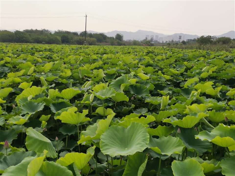 阳光下,微风拂过,无边的塘里绿浪翻滚、暗香浮动,当荷叶随风弯下腰后,一枝枝荷花骨朵就露了出来,大大小小、高高低低,开出一池丰收的喜悦。