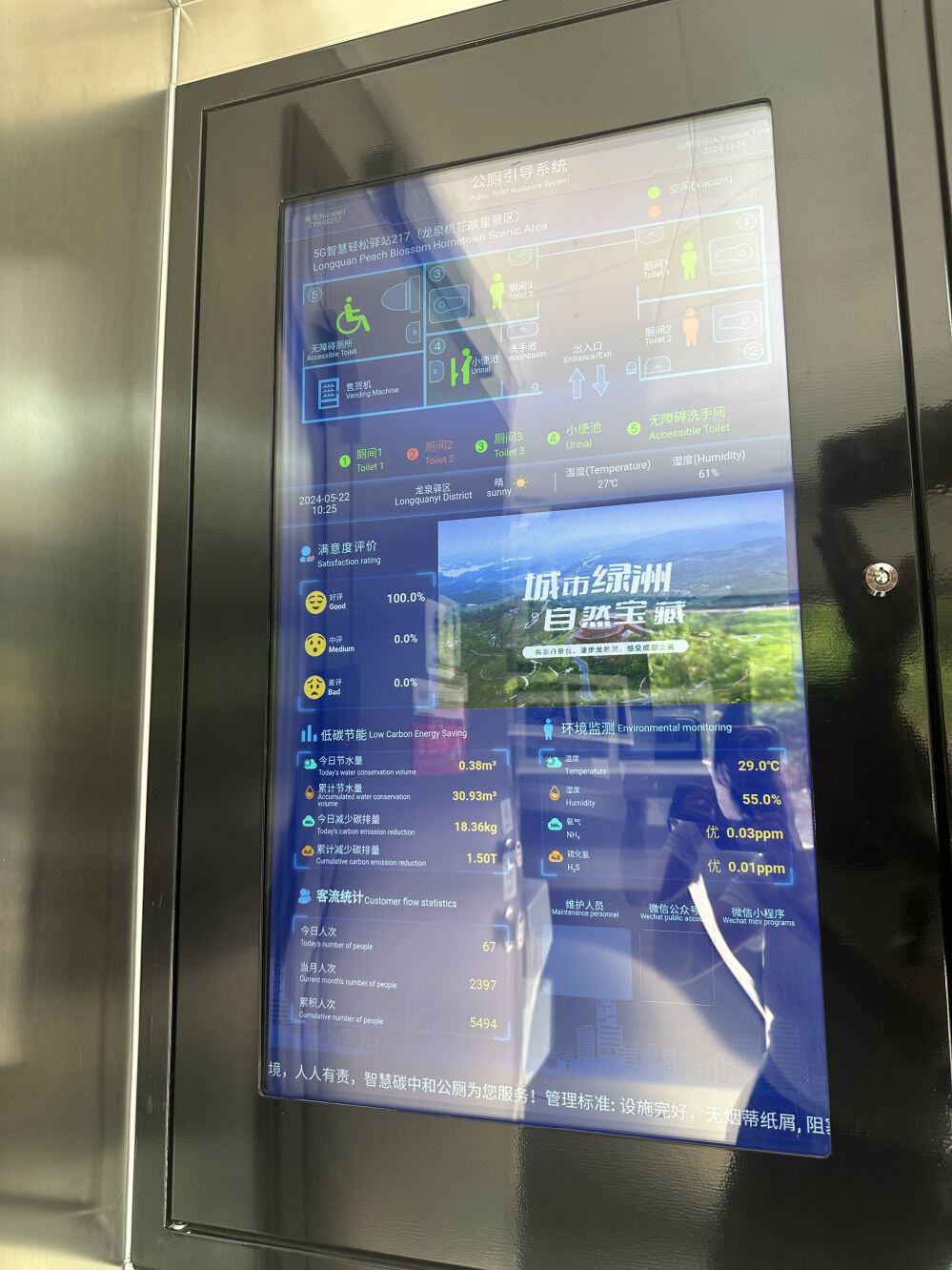 在公厕内,一块滚动的电子大屏引起了记者的注意,这便是公厕内的引导系统。大屏上,厕位信息、接待人数、公厕内的温度、湿度、氨气、硫化氢、用水量等指标一目了然。“第一次使用这种公厕,我觉得非常高端、大气、上档次,公厕不仅干净还很智能,使用下来非常满意。”一名游客在使用公厕后赞不绝口。