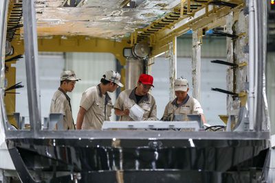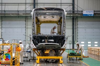 工人们正在生产新型氢能源智轨电车