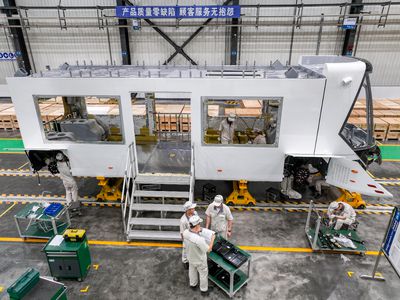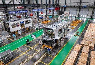 6月4日,在三江新区中车铁投轨道交通产业基地生产车间,工人们正在生产新型氢能源智轨电车。