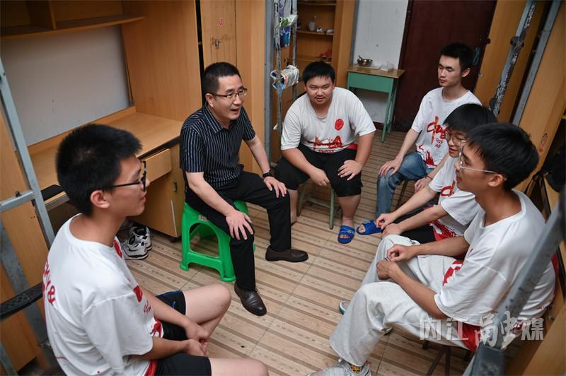 在高2024级二班,球溪高级中学党委书记、校长唐涛和同学们促膝谈心。考前心理疏导、考试细节处理、考后休息和用餐等,事无巨细,像父母叮嘱孩子一样。
