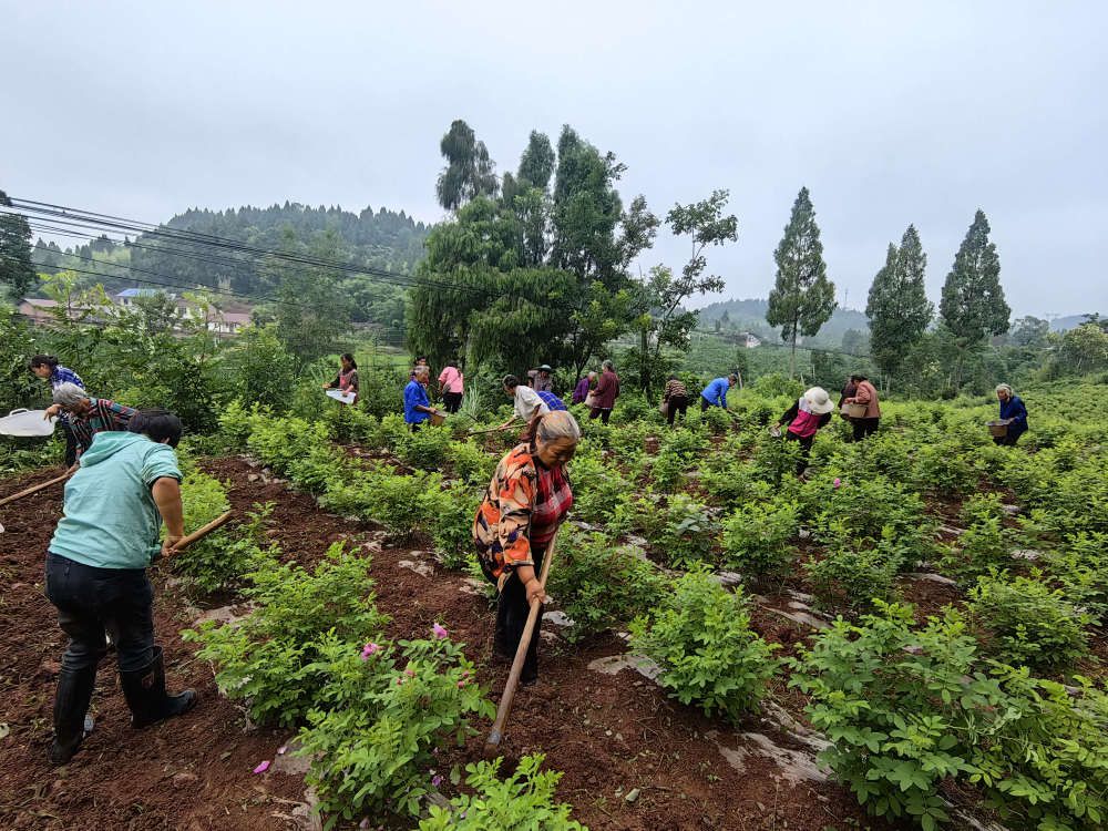 6月5日,记者走进四川省内江市东兴区高梁镇方家沟村,眼前是碧绿的荷塘、飘香的玫瑰、成片的紫苏、大豆、车前草等作物……村民们正趁着雨后泥土松软,在食用玫瑰之间播种大豆。