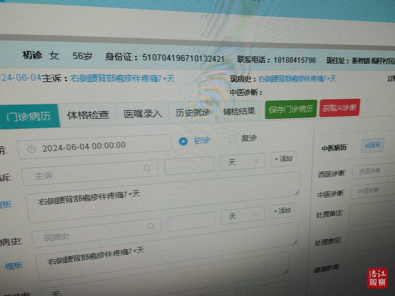 “这几天背上长了好多泡,又痒又痛,十分难受,去药店拿了一周的药吃,也不见好转。医生快帮我看看。”当日,在试点区域游仙新桥中心卫生院中医科,56岁的患者杨玉英(化名)找到主治医师邱伟就医。邱医生在询问其临床症状、把脉后,在基层公卫系统查询其历史病历后,运用中医AI辅助诊疗系统,为其提供诊疗。
