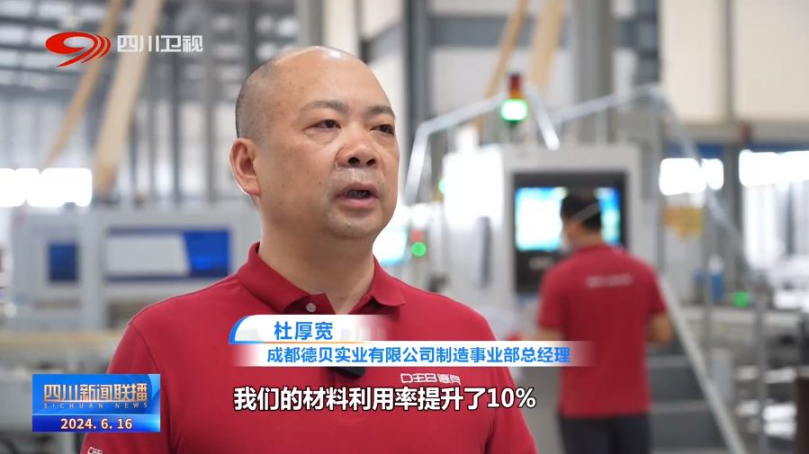 成都德贝实业有限公司制造事业部总经理 杜厚宽:智能设备投用后,我们的材料利用率提升了10%,单位产品成本降低了20%,而且产线质控更加精确,生产效率提升了80%,今年我们还计划投入600万元,把钻孔、包装等环节进行智能化产线改造,届时产品的生产周期还将再缩短2天。