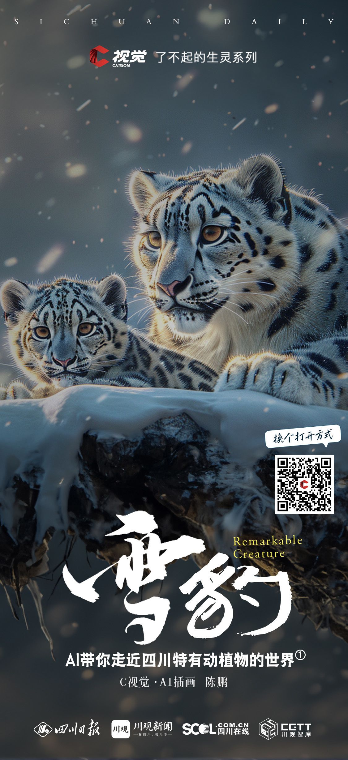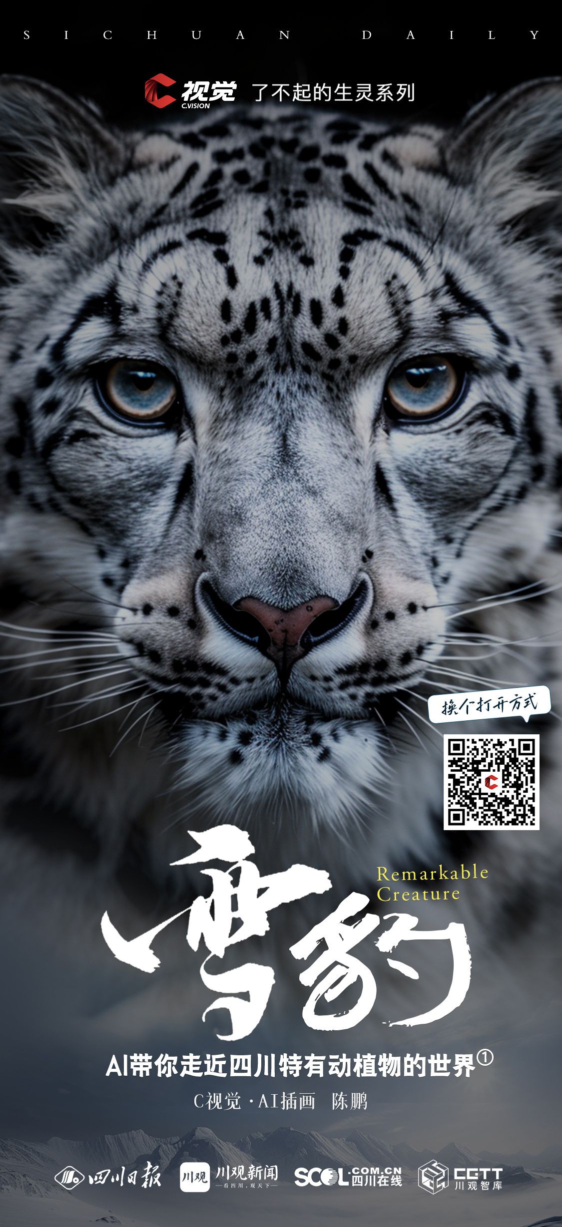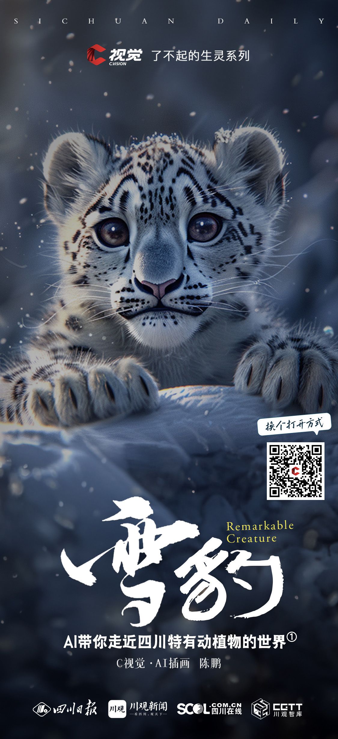升级迭代栏目产品形态,聚焦四川生物多样性,“了不起的生灵”栏目组联动C视觉设计师,采用新兴的AI技术,创新打造《换个打开方式 AI带你走近四川特有动植物的世界》系列科普视频,引领公众探索身边未知的自然奥秘,发现四川自然生态之美,激发全社会对生物多样性保护的关注与行动,促进人与自然和谐共生的文明共识。今日推出系列视频第一集,关注对象是“雪山之王”—雪豹。