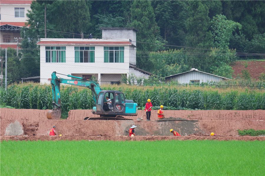 6月13日,在位于大英县蓬莱镇桅杆坝村的2024年高标准农田建设项目施工现场,挖掘机穿梭,上百名村民在田间砌筑石坎、修建水渠,一条条笔直的机耕道初见雏形。