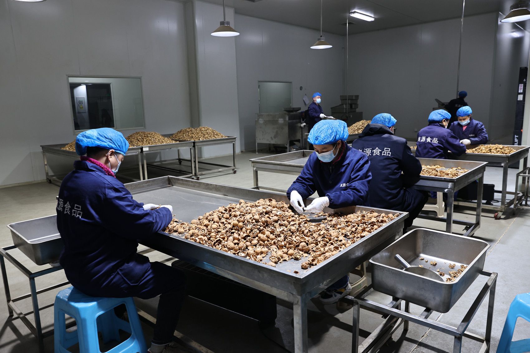 在南江县东榆工业园区良源食品有限公司车间,工人们正在加工核桃。(受访者供图)