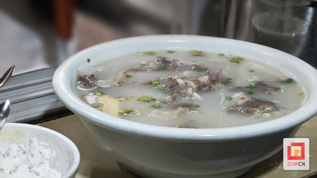 记者沿着这条巷子前行百余米,到了另一家老字号——天伦羊肉馆。店主朱江正在准备中午的食材,他以精湛的刀功将羊肉切成规格几乎一样的薄片。锅里的汤是从凌晨4点开始熬制的,香气四溢。早上喝一碗羊肉汤,是许多荣县人的习惯,因此这家羊肉馆清晨6点就得开门。“有时门还没开,外面就有人等着吃了。吃完了,有的去上班,有的去上学。”朱江说,不少家庭让孩子吃了羊肉汤再去学校上早自习。