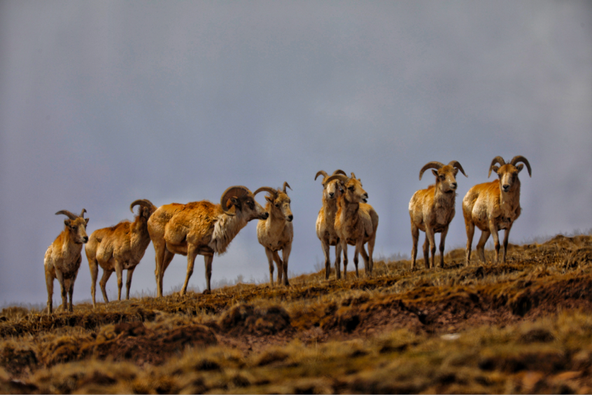 雄壮的雄性西藏盘羊注视着自己的族群(西华师范大学冯彬摄)