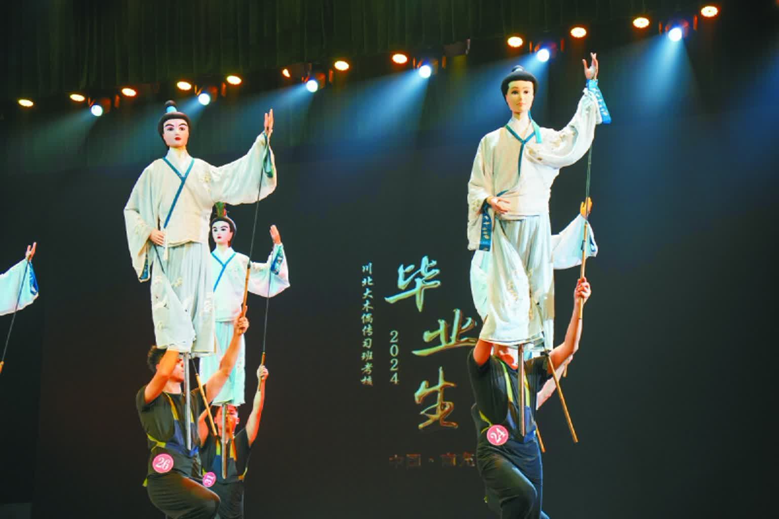 抬步、起身、翻手、扣手……在6月25日的毕业考核中,传习班表演专业的学生经过点子功、木偶掌式组合、步伐与圆场等多轮考核,个个操作熟练,向评委展示了6年的学习成果。“我们从木偶的操纵技艺,学生的身、台、形、表等方面来评判。”南充市舞蹈家协会主席、西华师范大学音乐学院副教授王沪川表示,学员们的基本功都很扎实,在考核中看到了技巧的呈现和应变能力。