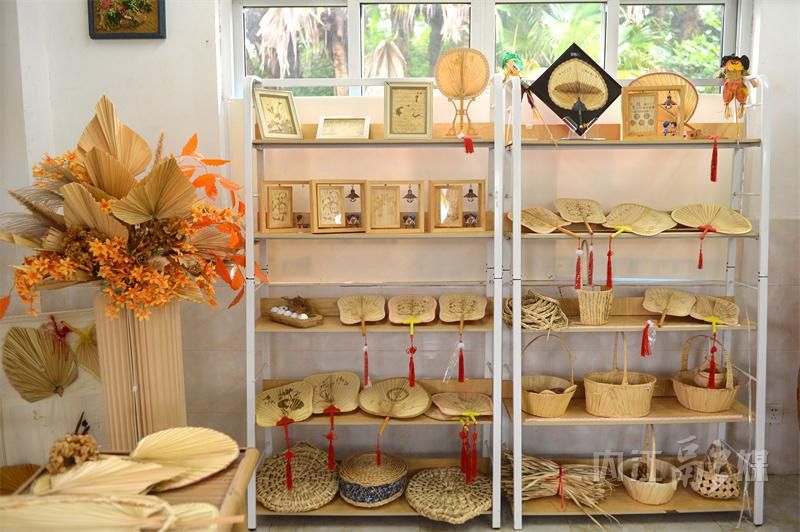 据了解,杨家镇金银嘴村村民上世纪20年代开始有少量的矮叶品种的蒲葵种植,蒲扇的手工制作大部分用于家用。上世纪70年代末引进广东蒲葵工艺,形成产业链条,开始大规模种植生产,从原来的采叶、晾晒、烘烤、压制、锁边老工艺到如今手工为主机器为辅的制作方式转变,并形成了独特的蒲扇“穿耳”技术,产品有普通团扇、桃心扇、芭蕉扇、烙画扇以及各类蒲葵工艺品。
