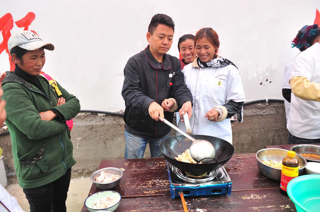 2017年10月17日,阿吼村第一驻村书记王小兵正在教彝族村民炒回锅肉。