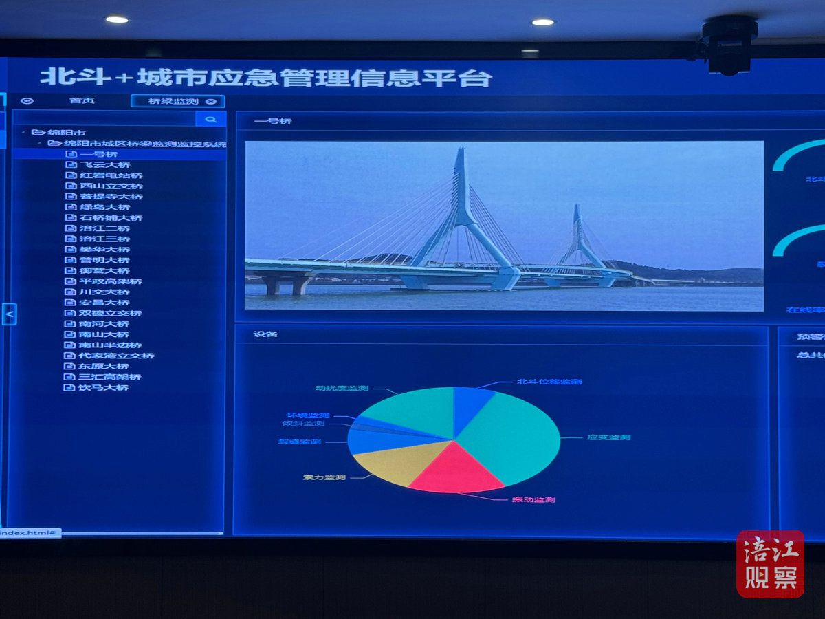“绵阳城区北斗桥梁监测预警平台在汛期扮演着重要作用。”绵阳市市政设施维护中心负责人介绍,这套系统已将城区23座市政车行桥梁纳入统一管理,通过卫星监测,链接物联设备,实时监测位移、振动、挠度、裂缝等,系统还会发出预警提示。通过回传数据和监控画面,桥梁管理者可对水位上涨可能对桥梁产生的安全隐患作出科学预判和处置决策。