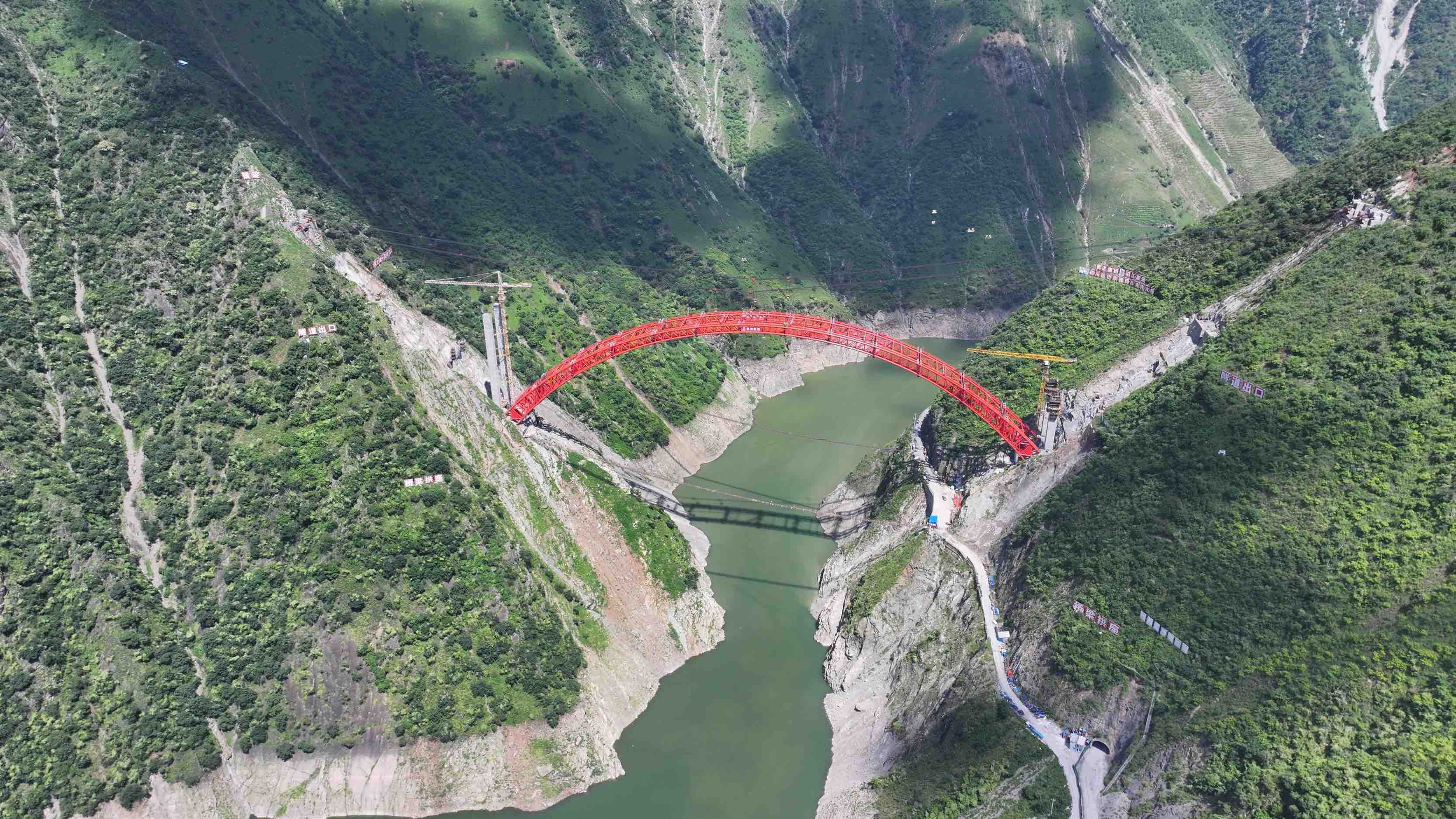 建设过程中,面对现场不具备施工场地条件的情况,参建团队创新性地采用了“无便道”施工法,利用缆索吊系统构建“空中运输便道”,实现了材料设备的高效运输。吊装时,桥梁钢结构在云南省黄华镇加工组拼后,通过船舶运输至现场,再利用缆索吊系统进行高空吊装,最大吊装高度达240米,相当于80层楼高,展现了令人震撼的“空中飞车”景象。