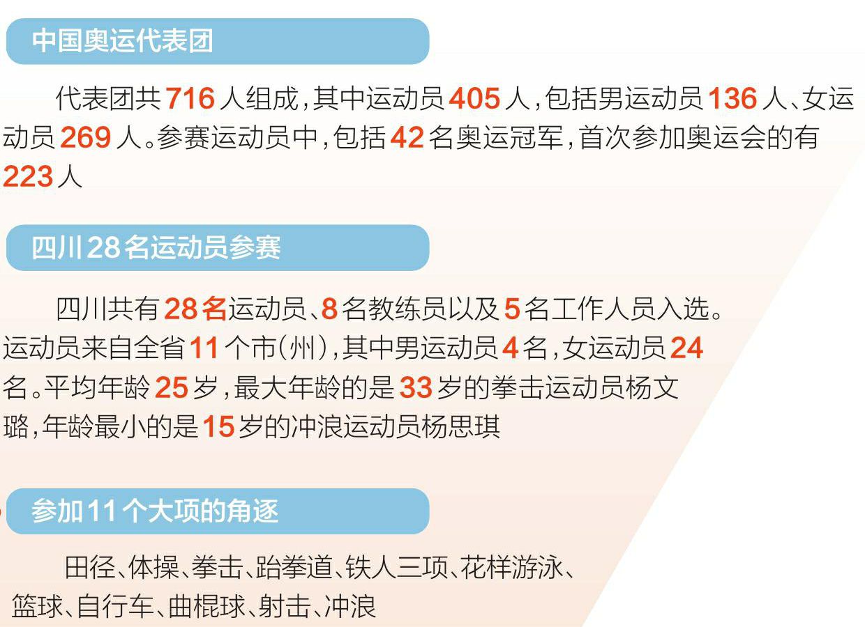 据四川省体育局统计,四川参加2024年巴黎奥运会的运动员既有老将领衔,又有新人崭露头角。28名运动员来自全省11个市(州),其中男运动员4名,女运动员24名。平均年龄25岁,年龄最大的是33岁的拳击运动员杨文璐,年龄最小的是15岁的冲浪运动员杨思琪。