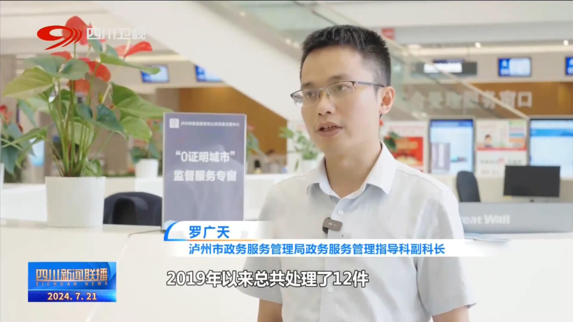 泸州市政务服务管理局政务服务管理指导科副科长 罗广天:2019年以来总共处理了12件,主要是监督行政单位、入驻机构有没有多收企业、群众的证明材料。下一步将进一步的深化“0证明城市”建设,再加强证明材料的取消在实际办理过程当中的应用,进一步提高企业群众的满意度。
