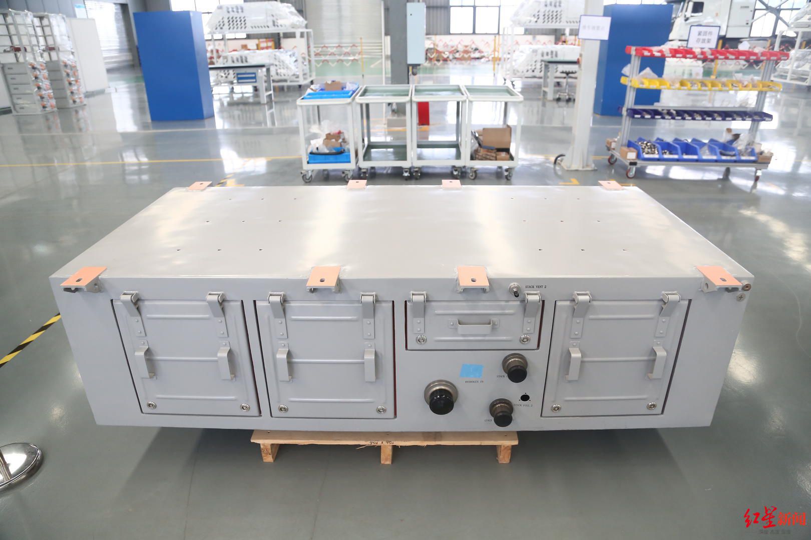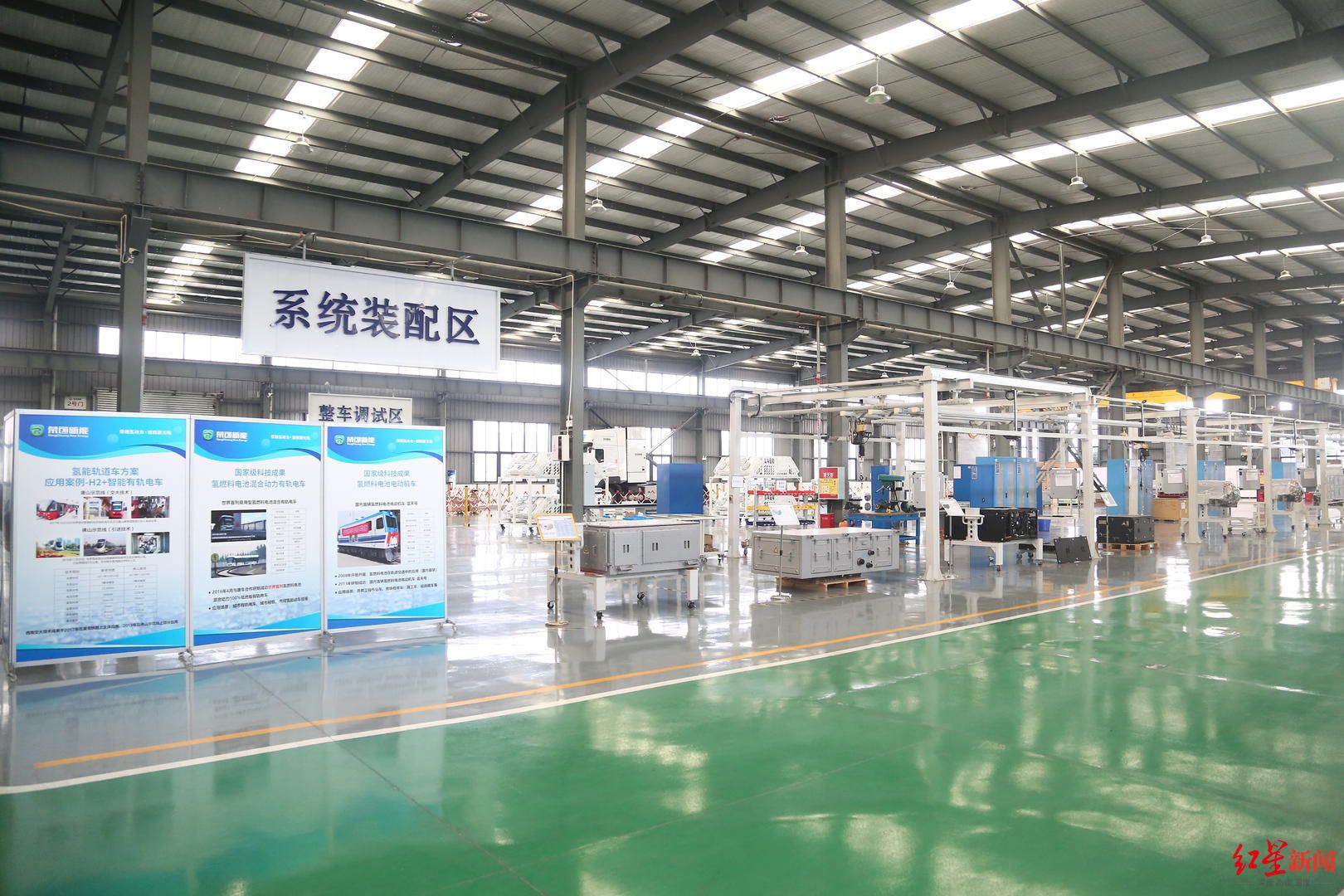 在装配车间,谈剑钊向记者展示了应用在该趟列车上的大功率燃料电池发电系统。她介绍,当时应用的是第一代产品,今年已经最新推出了第三代,不仅功率大幅提升,体积也缩小了一半。