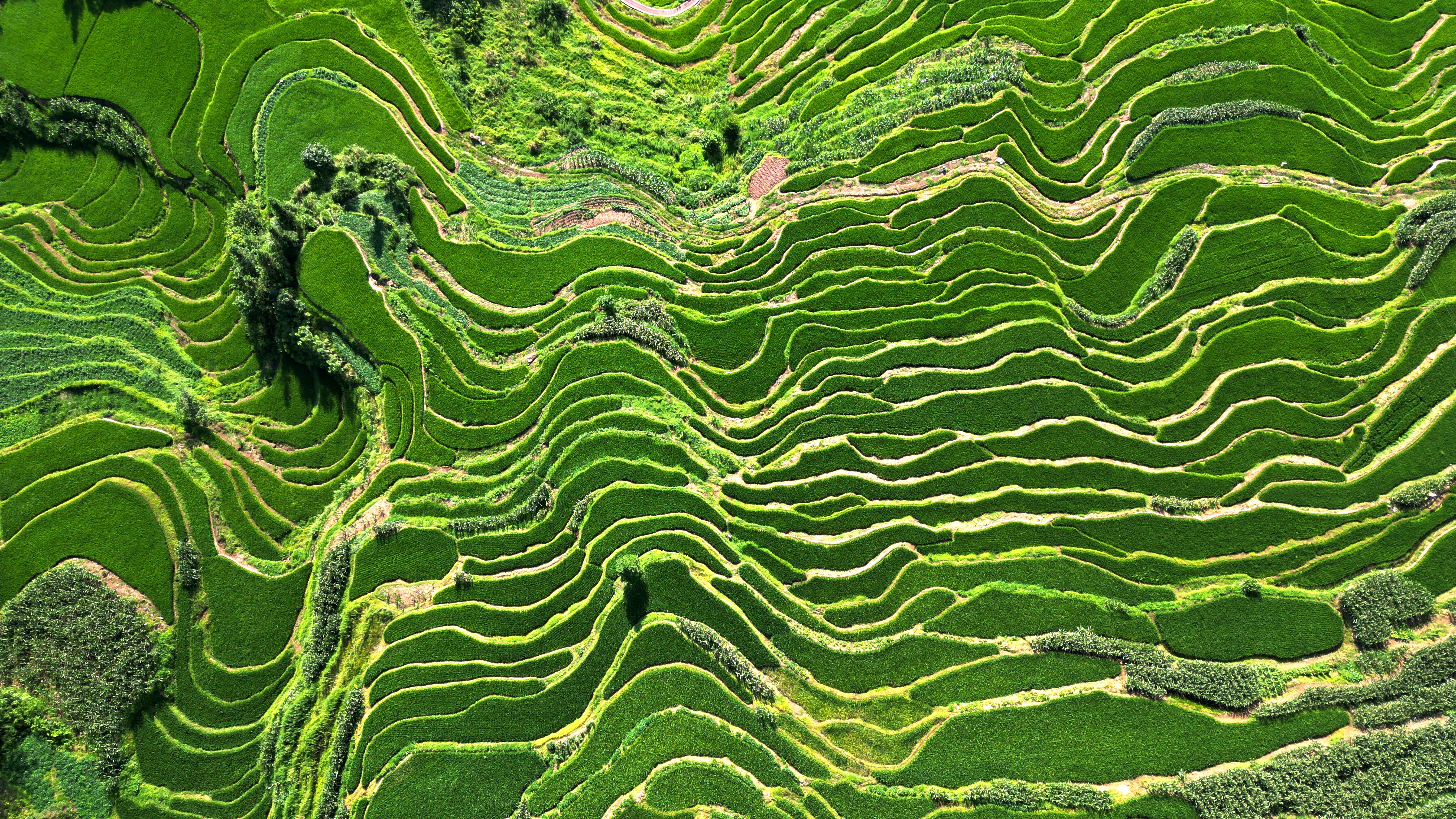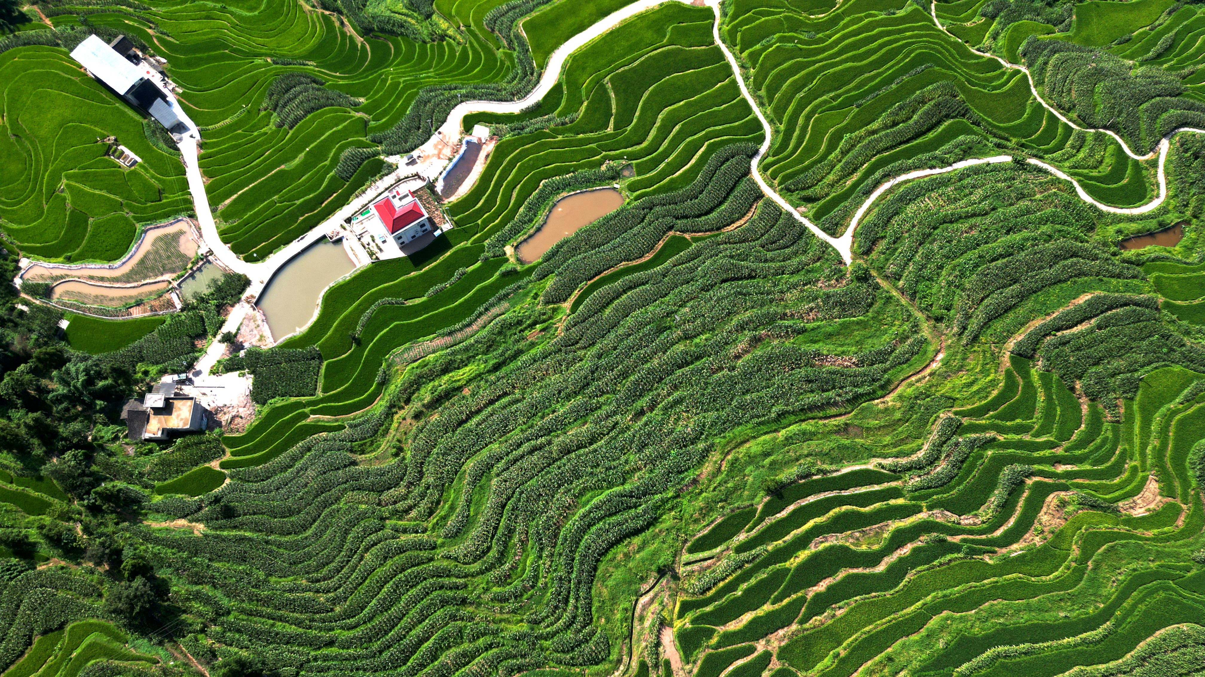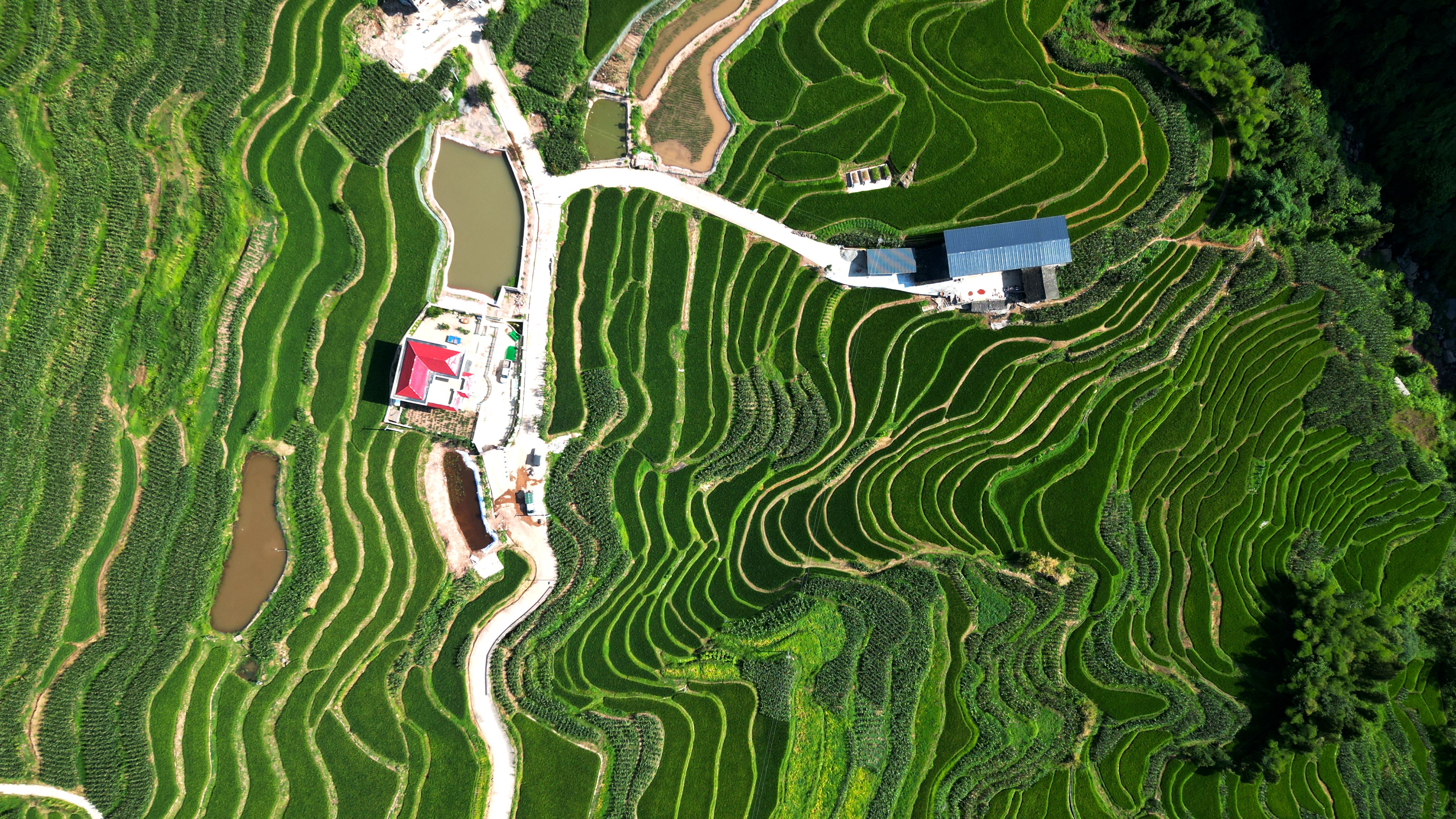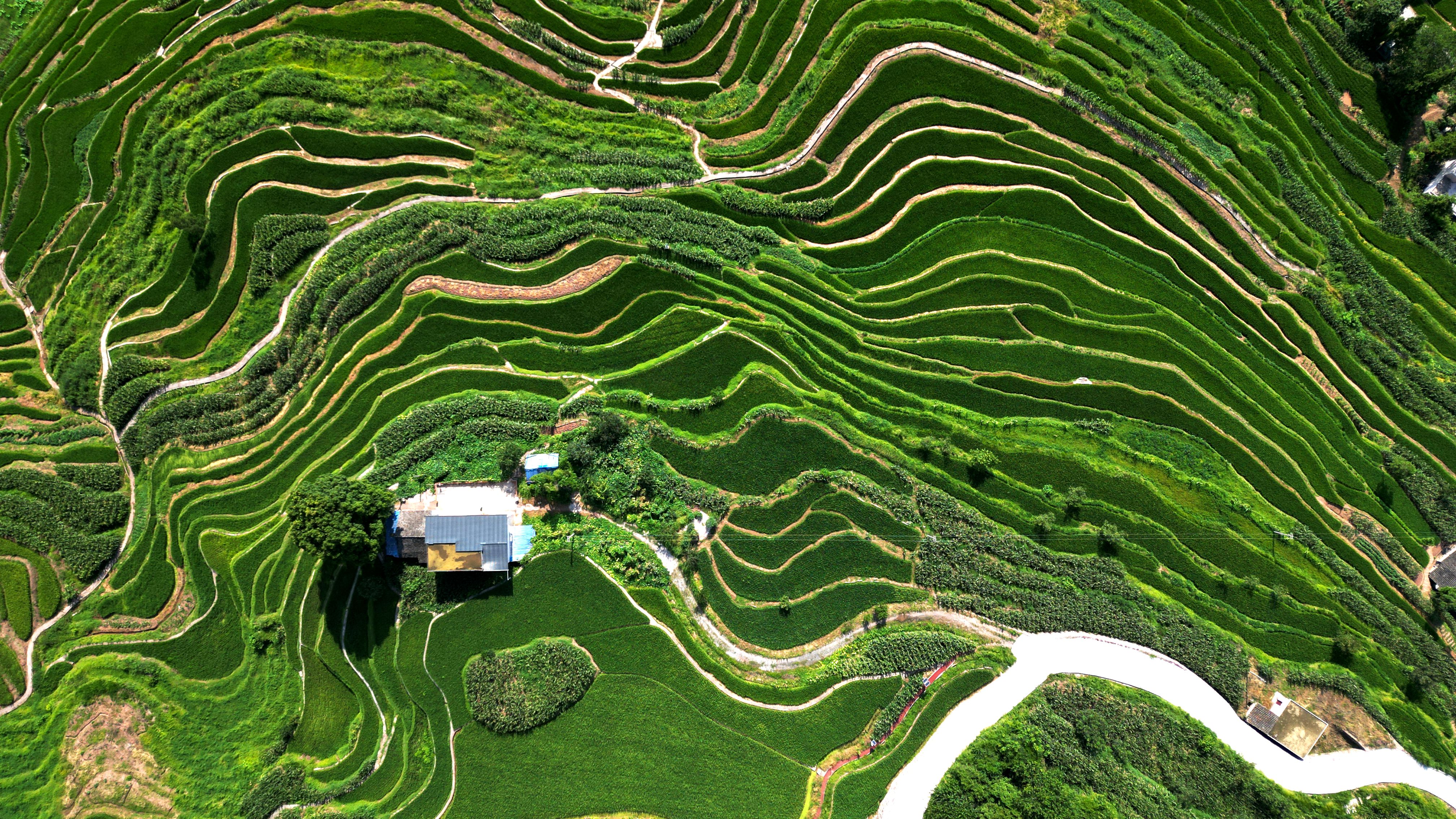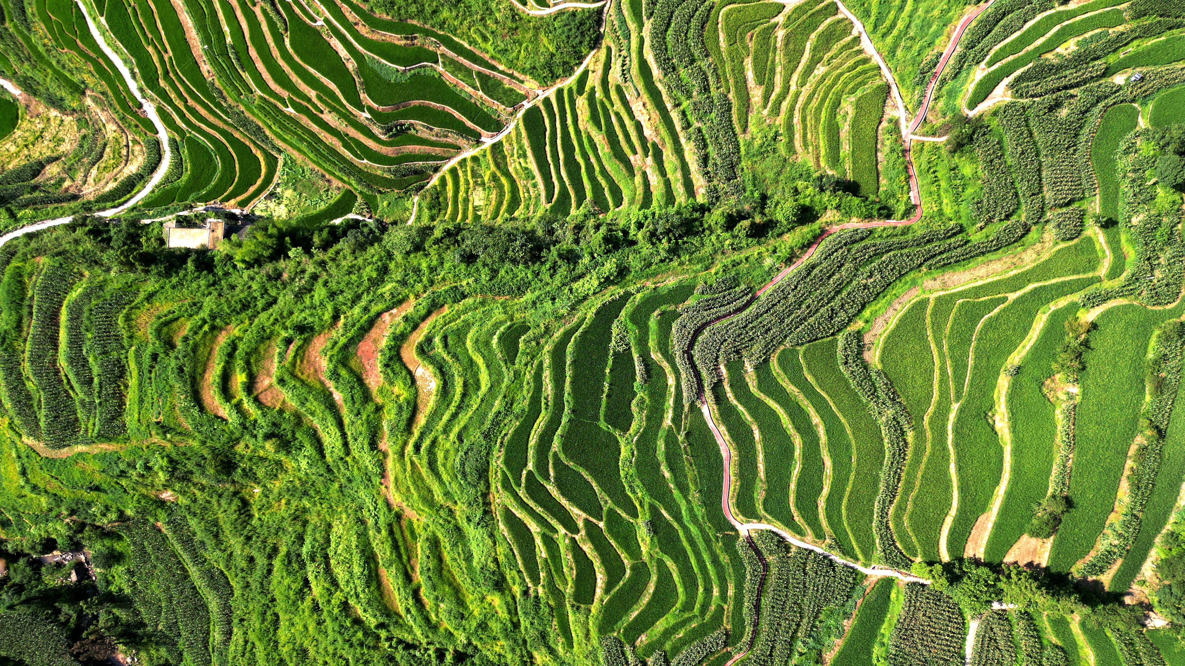 从田地到田埂,从梁峁到沟底,处处散发着夏日的气息,碧绿装满了整个梯田,遍布于黄土地上的万千沟壑。高空俯瞰,层层梯田如同千万条绿丝带,环绕在山川之间,一幕幕美丽的图景令人目不暇接。