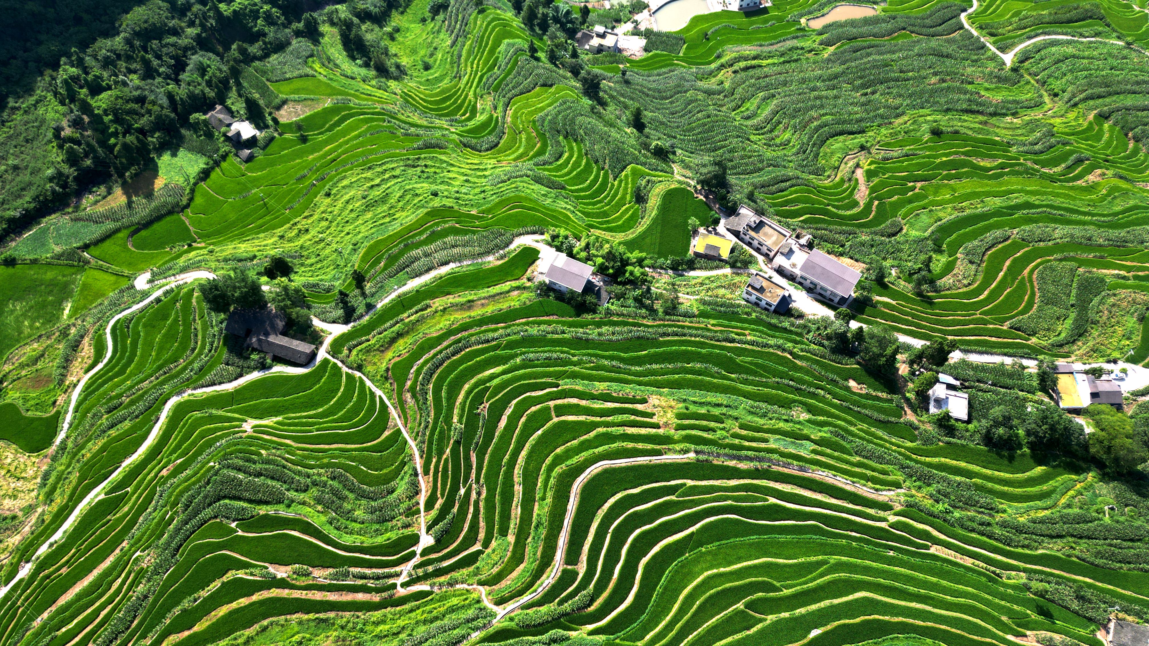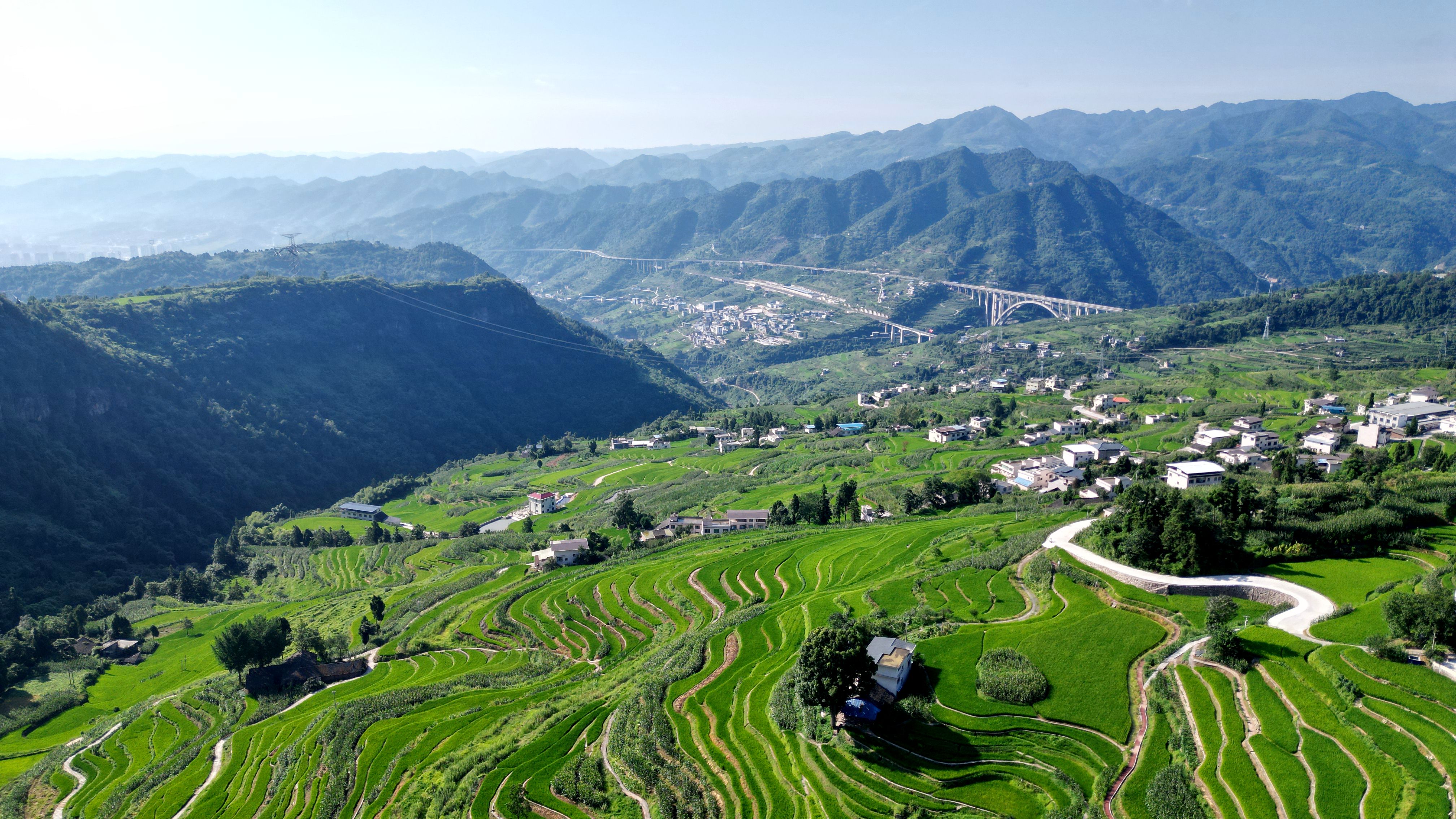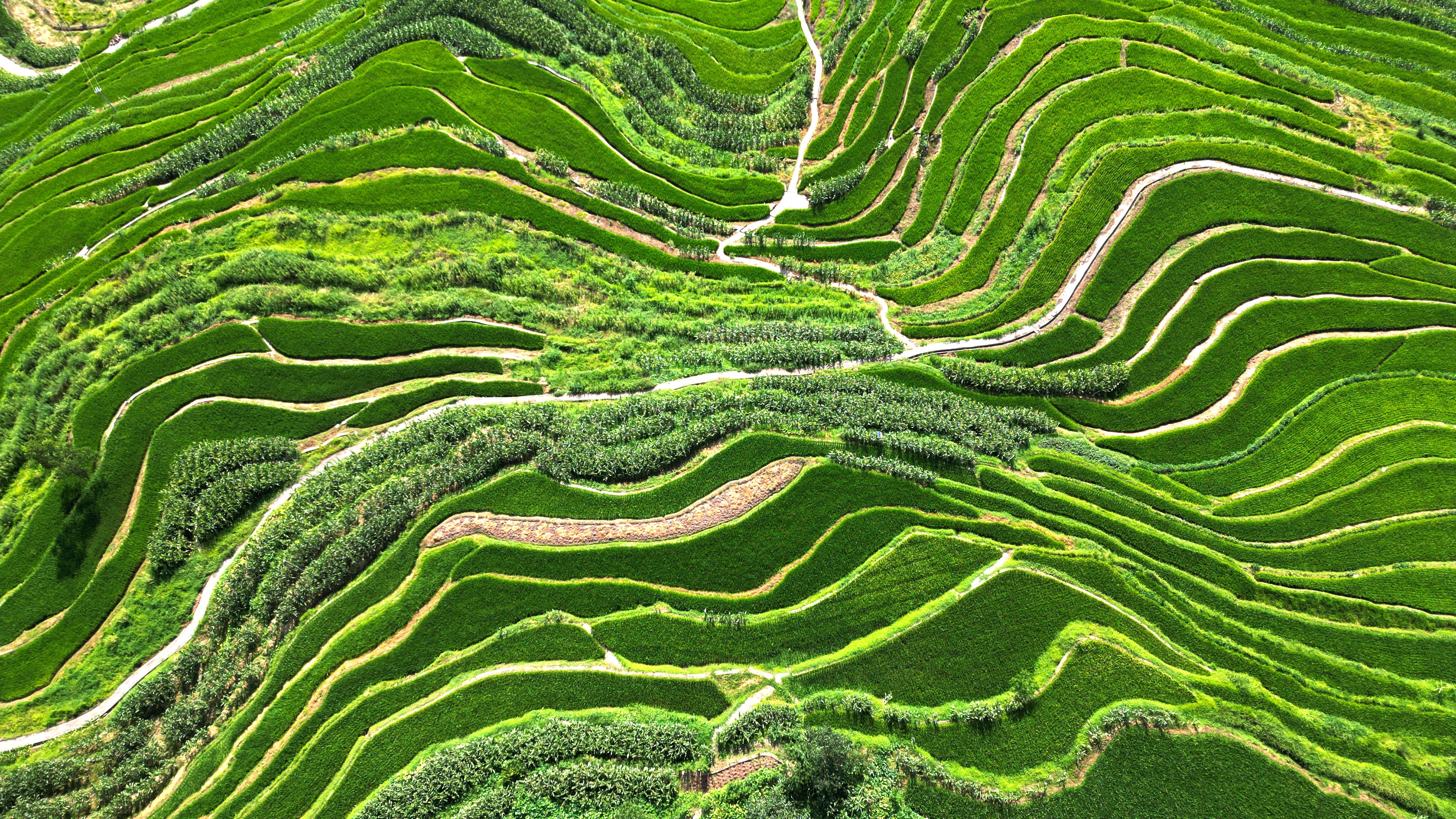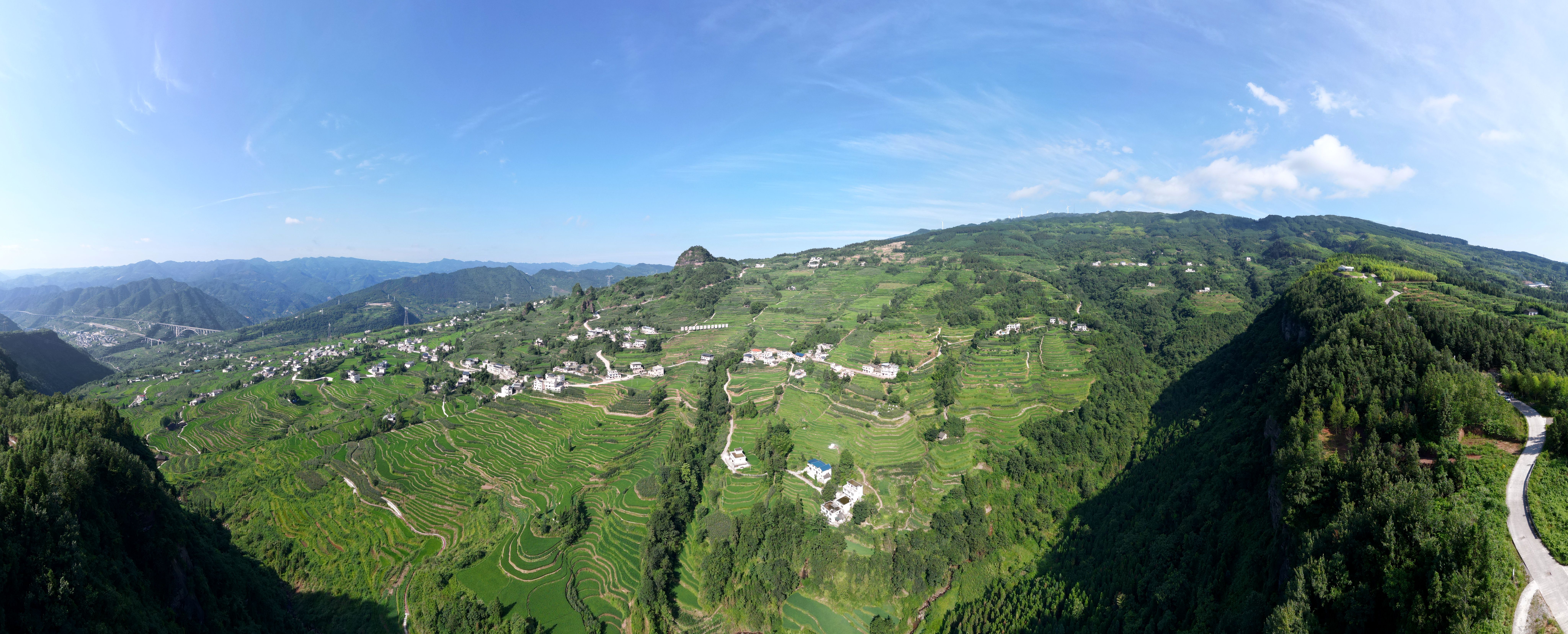 近日,在泸州市古蔺县德耀镇凤凰村万亩梯田,佳禾吐翠,长势正旺。一块块绿油油的梯田沿着山势延伸开来,和点缀其间的村庄构成了一幅美丽画卷。
