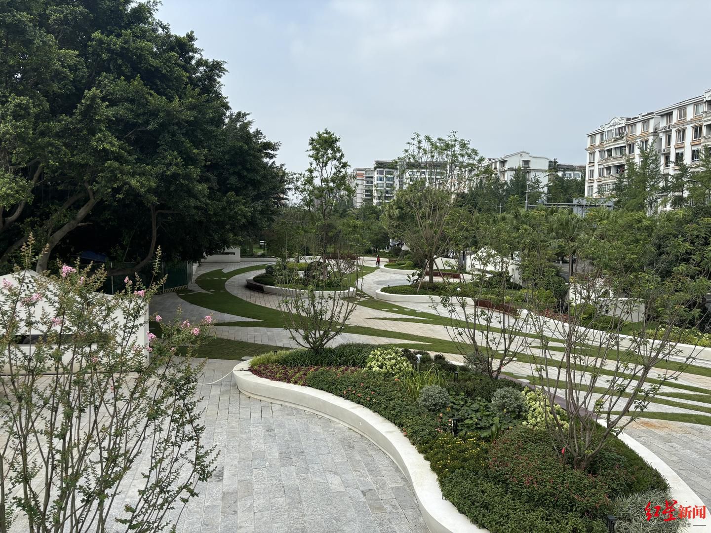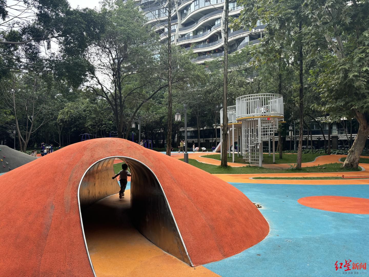 7月23日上午,红星新闻记者来到位于成都市武侯区丽都路1号的丽都公园。沿着五彩斑斓的花境和健身步道一路向前,高大的树撑开浓密的树冠,为过往的行人提供阴凉。公园内设置有羽毛球场、篮球场、网球场和儿童乐园……各个区域都有锻炼、玩耍的居民。
