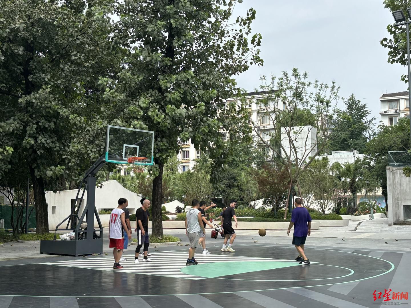 7月23日,不到上午10点,成都市武侯区丽都公园已经聚集了不少市民,有的挥汗如雨地争抢着手上的篮球,有的在乒乓球台旁挥动着球拍,还有小朋友们在娱乐设施区坐滑滑梯、攀爬攀岩墙……