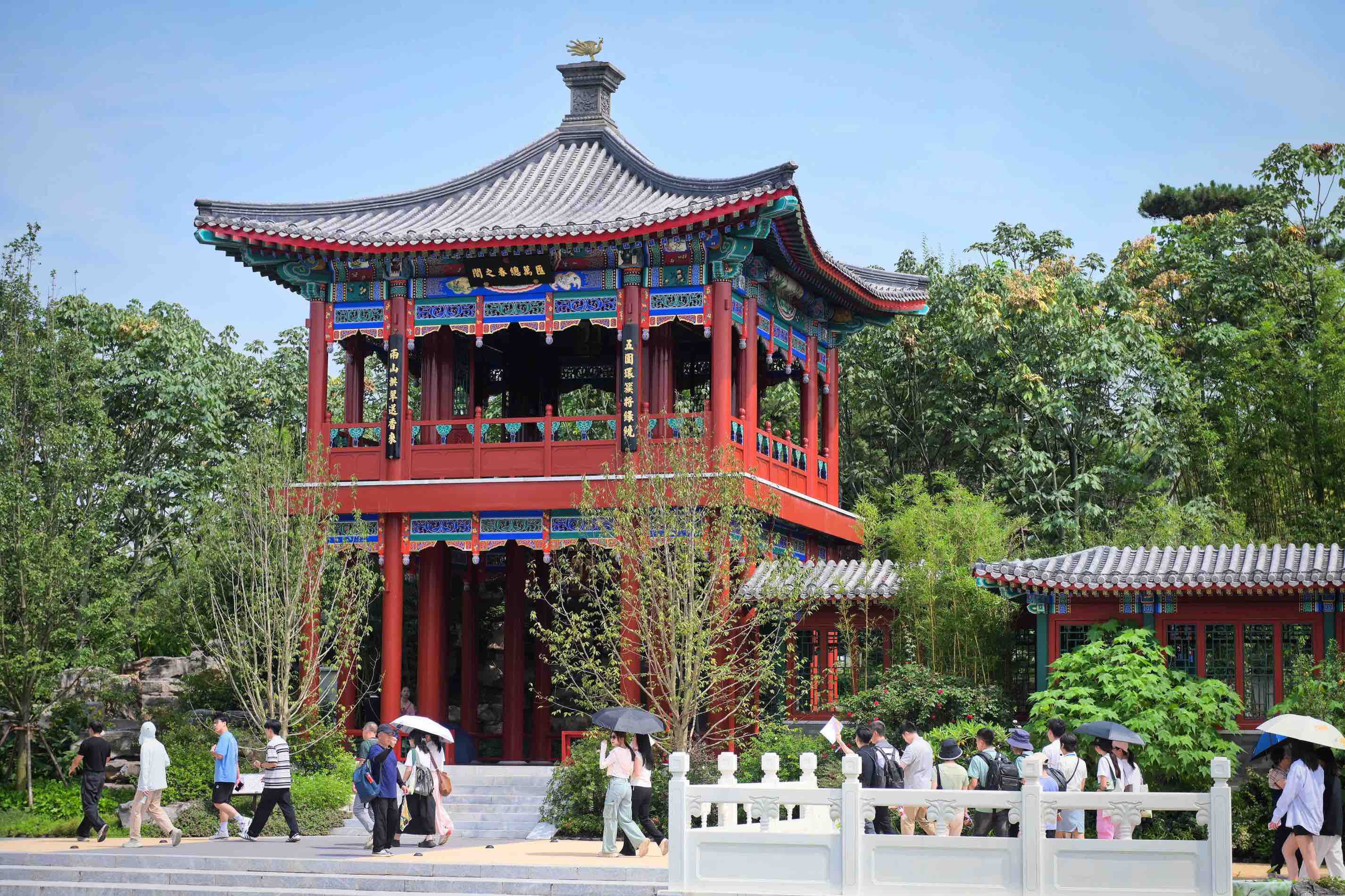 走入香港园,狮子山构架立刻跃入港澳代表的视野,园内的竹枝搭棚是一项传统建筑技术,也是香港非物质文化遗产之一。据了解,香港园由香港建筑署与成都设计企业共同打造,融合了香港城市特色和成都建筑技艺,展示了维港夜景、狮子山、非遗竹棚等特色元素,诠释了香港多元丰富而彼此和谐共存的人文和自然景观。澳门园和香港园是“邻居”,两座展园都充分体现了蓉港澳三地的相互交流和创新合作。