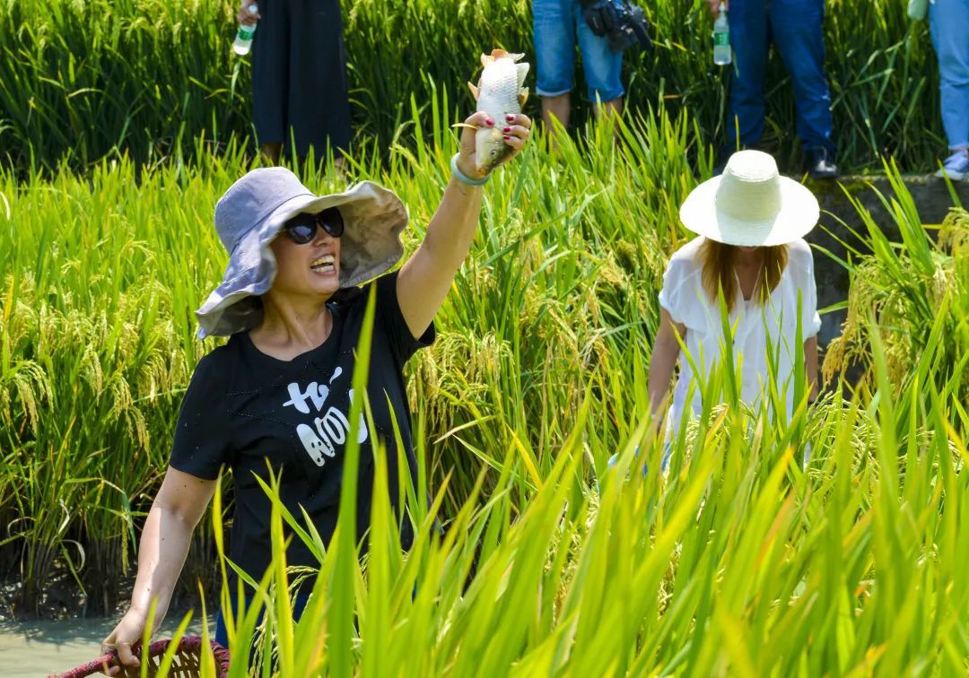 △稻花鱼节上,游客在稻田中捕捉稻花鱼