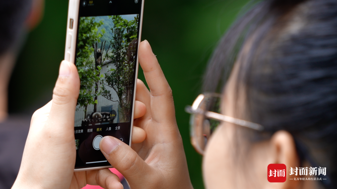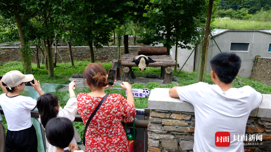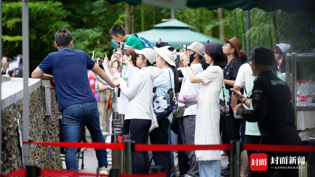 在基地内,看“福宝”需要排队候场,分批进入。每批人能隔着栅栏,静静看上5分钟,有人为此一次次排队进入,就是每批人的这5分钟,便有了无数关于“福宝”的短视频被分享到网上。