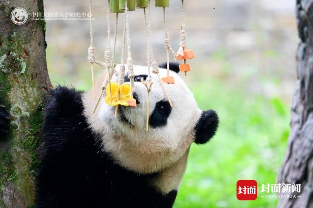 这是一个活泼好动、精力旺盛的年纪。在中国大熊猫保护研究中心卧龙神树坪基地,它一天需要被投喂30到40公斤竹子,5到10公斤竹笋。兴致上头,它爬树打滚、钻坑薅草,生日当天,看见基地准备的竹子鞭炮和竹子风铃后,它一掌薅起就往嘴里塞,吃着吃着顺势躺下,继续吃。