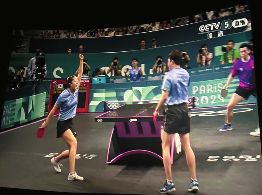 成都卢米埃影城(西宸天街店)正在转播巴黎奥运会乒乓球混双比赛