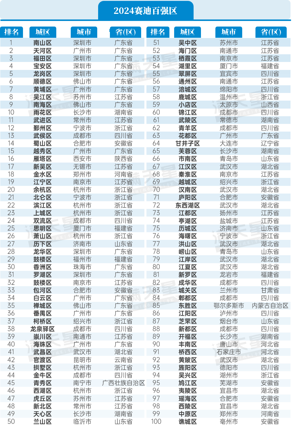 与去年相比,9个区实现了位次提升。其中,武侯区排名13位,较去年提升2位,双流区排名24位,较去年提升2位,翠屏区排名55位,较去年提升3位,涪城区排名57位,较去年提升2位,锦江区排名60位,较去年提升3位,成华区排名82位,较去年提升3位,江阳区排名86位,较去年提升3位,新都区排名88位,较去年提升3位,旌阳区排名93位,较去年提升2位。龙泉驿区、金牛区、青羊区、郫都区等4个区的位次与去年相比没有变化,分别为38位、44位、62位和84位。