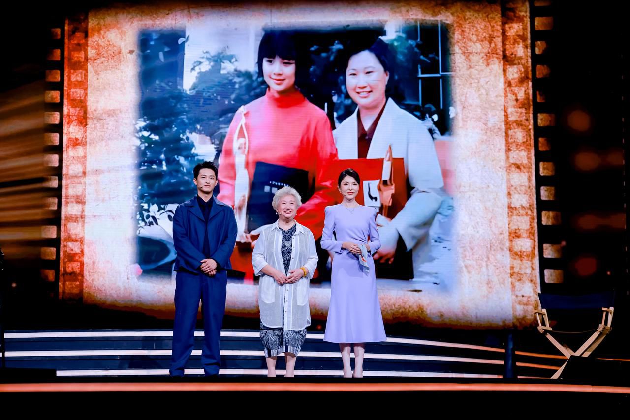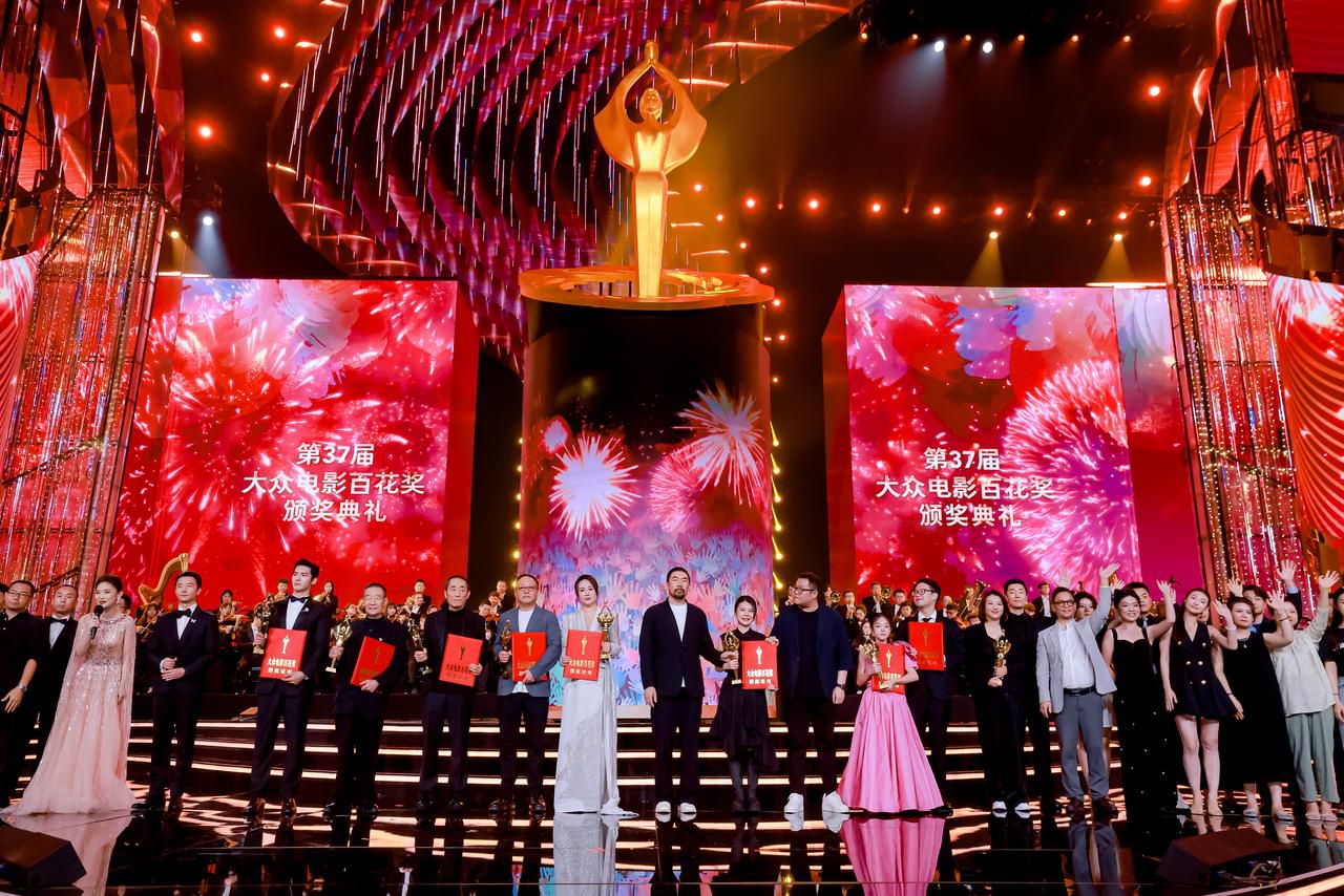 8月4日,在第37届大众电影百花奖颁奖典礼上,电影《长安三万里》获百花奖优秀影片奖。《长安三万里》主创谢君伟(左)、邹靖、宋依依(右)登台领奖。