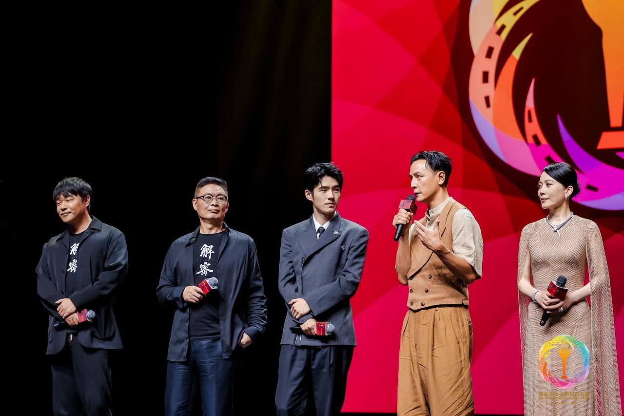 8月2日晚,电影《解密》导演陈思诚,原著作者麦家,演员刘昊然、吴彦祖、俞飞鸿、任璐遥、陈雨锶、王雨甜、周游亮相开幕式。