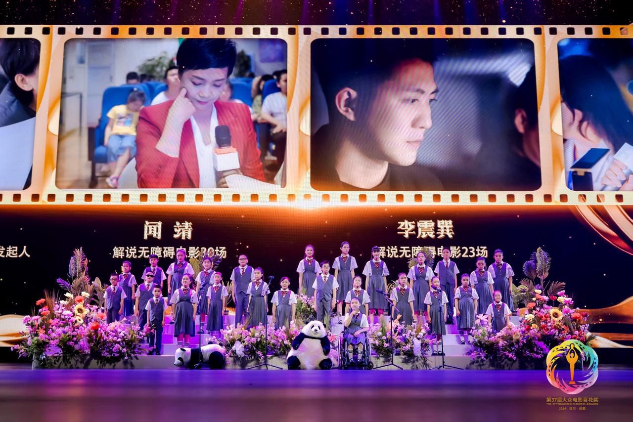 8月2日晚,第37届大众电影百花奖开幕式,导演郭帆(右3)与视障小朋友和无障碍电影解说员互动。