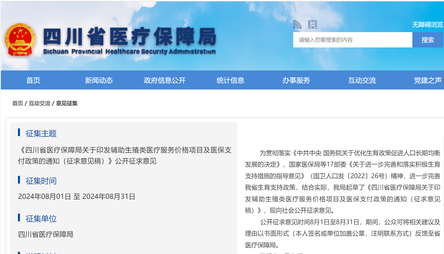 目前,已完成了辅助生殖类医疗服务项目立项评审、拟定价格、医保准入评审、待遇确定等程序,形成了《关于印发辅助生殖类医疗服务价格项目及医保支付政策的通知(征求意见稿)》(以下简称“征求意见稿”),并在8月1日至8月31日期间,通过该局官网公开征求社会意见。