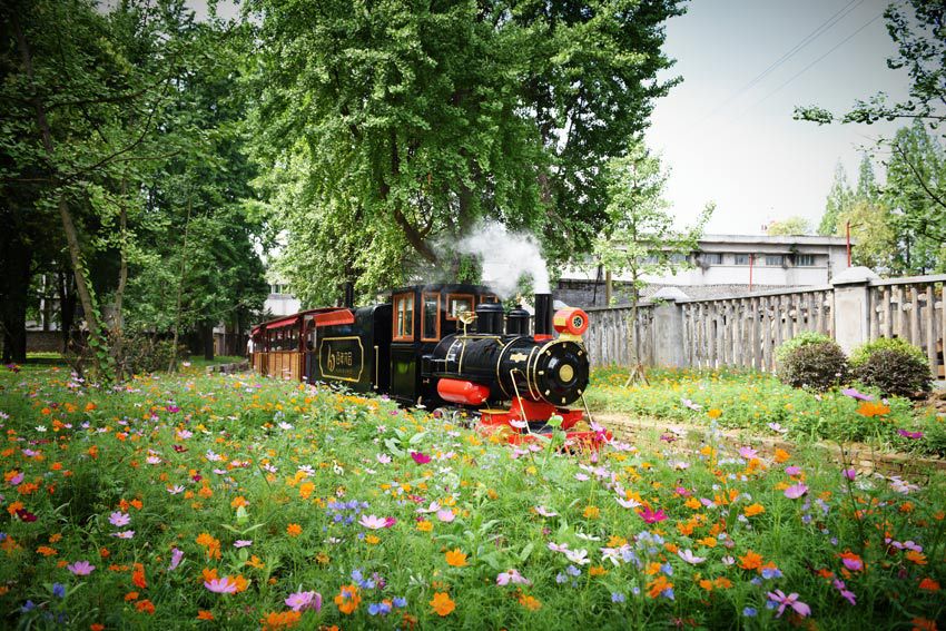 六合丝厂小火车穿越花海。高坪区委宣传部供图