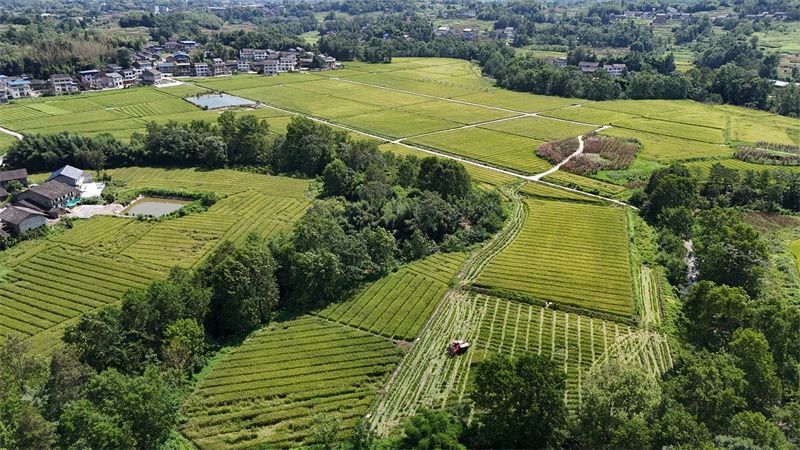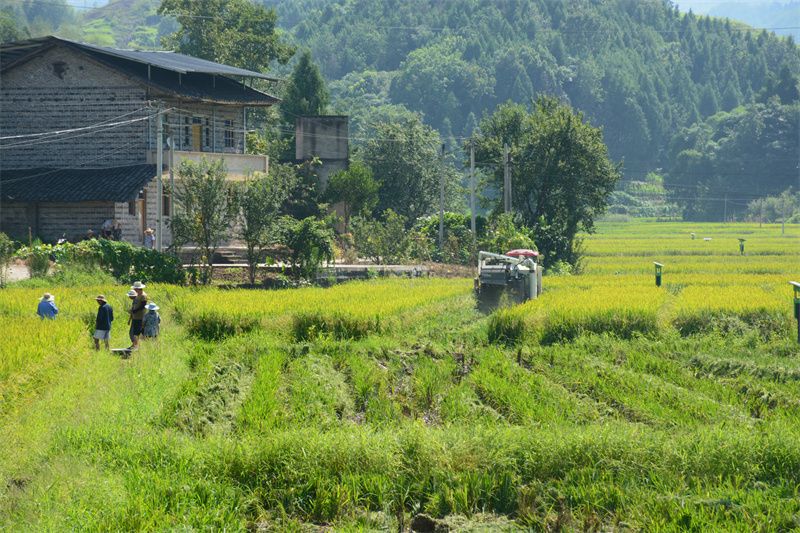 正值立秋,位于大竹县高明镇海乐村廖家坝的优质水稻制种现代农业园区一派繁忙,田埂旁,制种大户廖以祥正指挥收割机下田收稻种。
