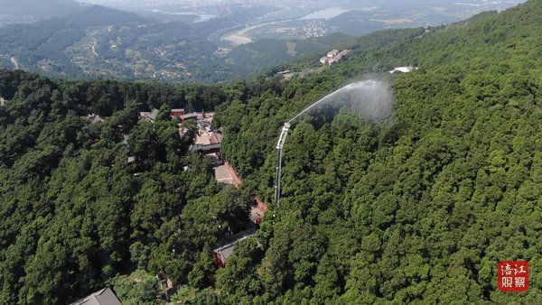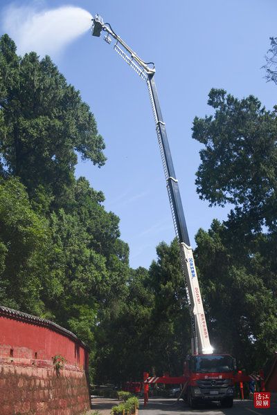 洒水降温“向云端”,高度达45米,射程直径最高达100米!这是8月14日,登高平台消防车在绵阳市梓潼县七曲山景区高空洒水对翠云廊古柏降温增湿的一幕,现场蔚为壮观。