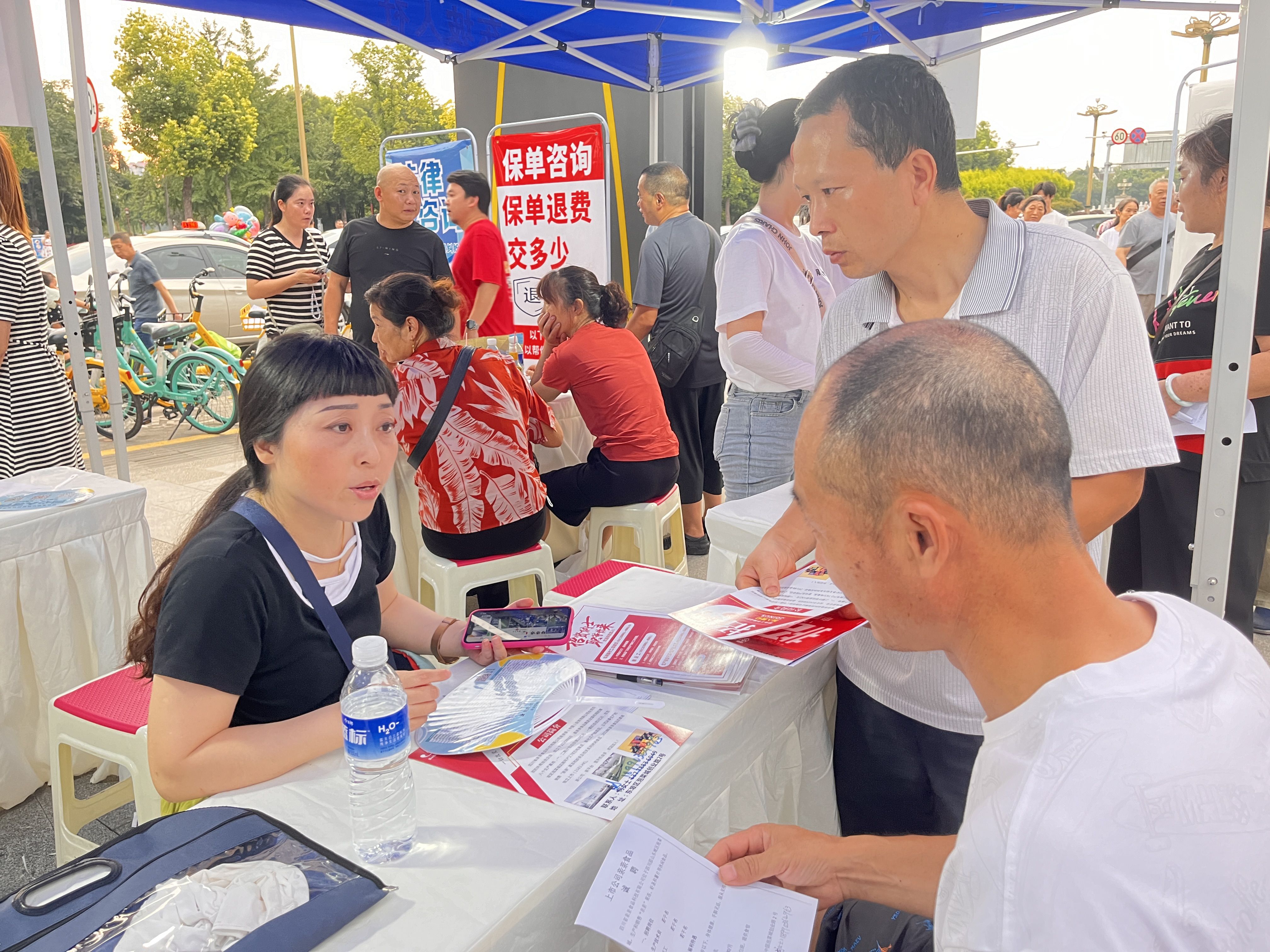 活动现场,一顶顶蓝色帐篷整齐摆放,各企业人力资源负责人化身“摊主”热情吆喝,主动介绍岗位招聘条件、薪资待遇、福利补贴等情况,吸引求职者们纷纷驻足,求职者则以“顾客”的身份仔细咨询企业发展情况和岗位需求。