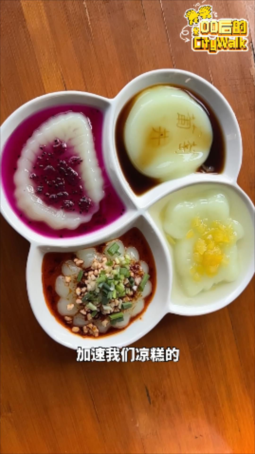 现在,双河凉糕除了传统的红糖味,还开发出了百香果味、菠萝味、玫瑰味、桂花味、芒果味……甚至,还有适合川渝宝宝体质的麻辣味!白白嫩嫩的凉糕淋满了辣椒油、花生碎、葱花,燃面的外表搭配凉糕的口感,一口下肚,让人瞬间体验什么叫“冰火两重天”!
