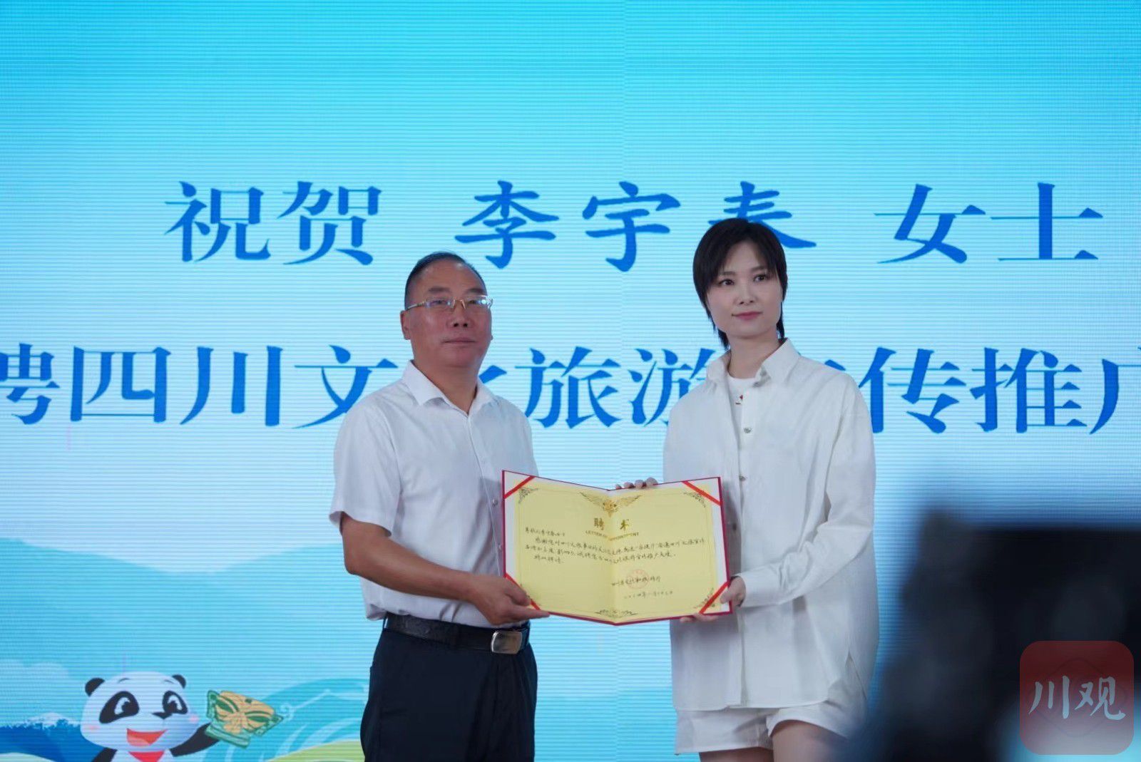 仪式上,在四川文旅吉祥物“安逸熊猫”引导下,李宇春接过四川省文化和旅游厅颁发的聘书。对于这个新身份,李宇春满含乡情:“我是四川的女儿,这次回到家乡,看到熟悉的画面和场景,好像唤醒了流淌在我血液里的家乡情愫。这项任命对我来说是一份殊荣也是一种责任,未来我也将继续传播优秀巴蜀文化,让更多人因为我而发现四川、认识四川、爱上四川。”